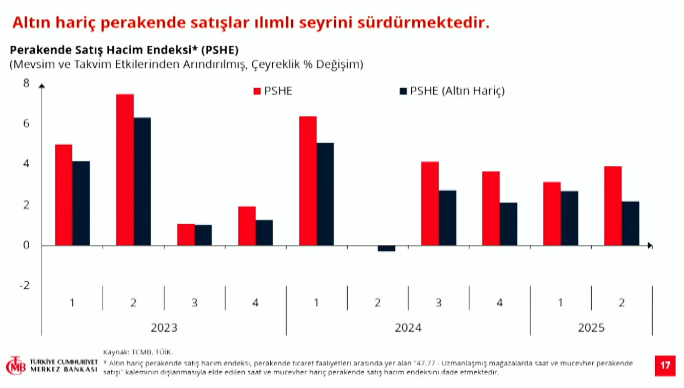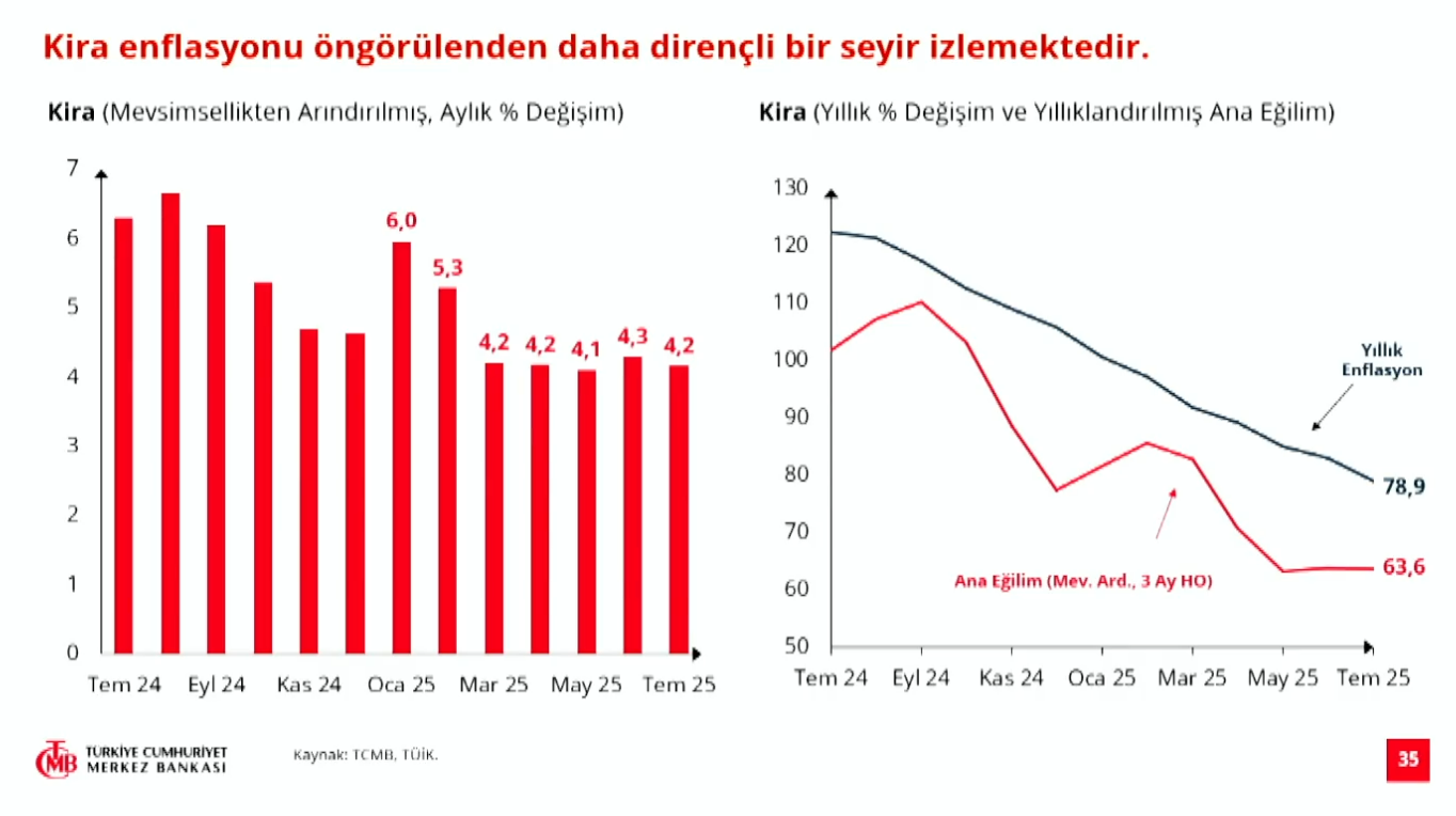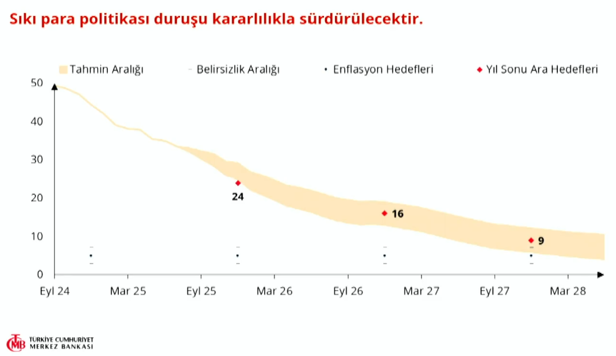 TCMB Başkanı Fatih Karahan, yılın 3. Enflasyon Raporu sunumunda, Merkez Bankası'nın enflasyon hedeflerini açıkladı. 2025 yılının ilk toplantısında yıl sonu enflasyon beklentisini yüzde 21’den yüzde 24’e çıkaran, ikinci toplantısında ise yıl sonu enflasyon hedefini yüzde 24 seviyesinde sabit tutan TCMB, yılın 3. Enflasyon Raporu’nun tanıtımı amacıyla TCMB İdare Merkezi'nde bilgilendirme toplantısı düzenledi. Toplantıya TCMB’nin tarihine iz bırakmış yetkilileri kaybetmenin hüzüntüsünü yaşadıklarını bildirerek başlayan TCMB Başkanı Karahan, şunları aktardı: “Sıkı para politikamızın sonucunu kademeli bir şekilde almaya devam ediyoruz. Fiyat istikrarının sağlanması noktasında aldığımız mesafeyi önemsiyoruz. Önümüzdeki dönemde tüm para politikası araçlarını kullanmaya devam edeceğiz. Küresel ticaret politikalarına dair belirsizlik, ikili anlaşmalarla azalsa da yüksek düzeyini koruyor. Anlaşmalar daha düşük tarifeler üzerinden yapıldı, bununla birlikte sektörel tarifeler yürürlükte kalmaya devam ediyor. Jeopolitik riskler küresel ekonomi üzerinde belirleyici olmaya devam ediyor. Belirsizliğin son dönemde azalması küresel büyüme yönünde sınırlı iyileşmeye neden oldu. Enerji ve emtia fiyatları geçtiğimiz döneme kıyasla bir miktar arttı. Enerji hariç tarafta endüstriyel metal tarafında tarifelerin etkisiyle artış gözlemledik. Enflasyon ve büyüme görünümlerine bağlı olarak faiz beklentileri değişiyor. Yüksek borçluluk nedeniyle tahvil getirileriyle ilgili risk algısı arttı. Hisse senedi piyasaları ise küresel ölçekte olumlu bir hava sergiledi. Yurt içi piyasa görünümü Sıkı para politikası sonucunda talep kompozisyonu daha dengeli hale geldi. İlk çeyrekte özel tüketimin yıllık büyümesi yavaşladı. Özel tüketimin büyümeye katkısı belirgin olarak geriledi. İlk çeyrekte yurt içi talep zayıfladı, dış denge iyileşti. İkinci çeyrekte üretim göstergelerinin büyümesi yavaşladı. Anket bazlı göstergeler sanayide zayıflayan bir görünüme işaret ediyor. İşgücü piyasası manşet işsizlik oranının ima ettiğine kıyasla daha az sıkı. İkinci çeyrekte yurt içi talepte ivme kaybı sürdü. Altın hariç perakende satışlar ılımlı seyrini sürdürdü. Enflasyon görünümü 2024 Haziran ayında başlayan dezenflasyon süreci devam ediyor. Enflasyon mayıs zirvesinden bu yana 42 puan düşüş kaydetti. Ağustos verileri bu eğilimin devam ettiğini gösteriyor. Enflasyon üç ayda beklentilerin altında gerçekleşse de hizmet sektöründeki atalet devam ediyor. Alt gruplar bazında baktığımızda kademeli yavaşlama sergileyen hizmet enflasyonu sağlık, kira gibi kalemlerin etkisiyle bir miktar yükseldi. Temel mal enflasyonu ise nisan sonrası kur gelişmelerinin etkisiyle yükselse de bu durum geçici oldu. Zirai don yılın ilk yarısında gıda fiyatlarını olumsuz etkilese de bu etki kısa sürdü. Emtia fiyatları mart ayında gerileme eğilimine girmişti. İkinci raporda emtia varsayımlarımızı aşağı yönlü güncellemiştik. Haziran ayında gerçekleşen jeopolitik olaylar bu durumu tersine çevirdi. Son aylarda artan sıcaklıklara paralel olarak bazı bölgelerde kuraklığın arttığını görmekteyiz. Belirginleşen riskler gıda fiyatlarındaki yukarı yönlü baskıları artırıyor. Kira enflasyonunun gerilemeye devam edeceğini öngörüyoruz. Raporlar bu aşağı yönlü görünümü teyit ediyor. Bununla birlikte kira enflasyonunun öngörülenden daha dirençli bir performans sergilediğini not etmemiz gerekiyor. Para politikası duruşu Temmuz ayında para politikasında gerekli sıkılığı koruyacak şekilde politika faizini yüzde 43 seviyesine çektik. Olası oynaklıklara karşı parasal aktarımı tedbirlerle destekliyor, etkin bir likidite yönetimi uygulamaya devam ediyoruz. TL'nin mevduat payını artırmayı ve KKM'yi sona erdirmeyi planlıyoruz. Sistemdeki fazla likiditeyi depo alım ihaleleri ve ters swap işlemleriyle sterilize ediyoruz. Uyguladığımız adımlarla faizler politika faizine yakın seyrediyor. Mevduat faizlerinin seviyesi TL'ye geçişi desteklemeye devam ediyor. Bireysel kredi büyümesi kredi kartı harcamaları kaynaklı hızlandı. TCMB'nin orta vadeli tahminleri Enflasyon raporu hedeflerinde değişikliğe gitmeye karar verdik. Bundan sonra veri akışıyla revize edebileceğimiz hedefler ile değiştirmeyeceğimiz ara hedefler olacak. Ara hedefler içsel para politikasında referans olacak. Böylece enflasyonun ara hedeflere yakınsaması sağlanacak. Enflasyonun 2025 yıl sonunda yüzde 25 ile yüzde 29 aralığında olacağını, 2026 sonunda ise yüzde 13 ila yüzde 19 aralığına ineceğini öngörüyoruz. Tahmin aralığını önceki rapora göre daralttık. Bu değerler önceden paylaştığımız aralıkları yansıtıyor. Bu raporda enflasyon ara hedeflerini paylaşacağım. Geçtiğimiz raporda yıl sonu enflasyon hedefi olan yüzde 24’ü ara hedefimiz olarak koruyoruz. 2026 ve 2027 yılları için ise enflasyon hedefimizi sırasıyla yüzde 16 (Önceki yüzde 12) ve yüzde 9 (Önceki yüzde 8) olarak belirledik.