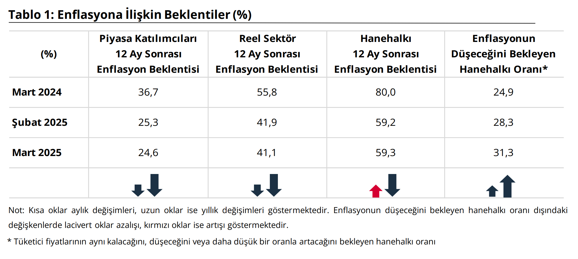 Türkiye Cumhuriyet Merkez Bankası (TCMB), mart ayında piyasa katılımcıları, reel sektör ve hanehalkının 12 ay sonrasına ilişkin enflasyon beklentisini açıkladı. TCMB, Mart 2025 dönemine ilişkin "Sektörel Enflasyon Beklentileri"ni yayımladı. Piyasa Katılımcıları Anketi, İktisadi Yönelim Anketi ve Türkiye İstatistik Kurumu (TÜİK) iş birliğiyle yürütülen Tüketici Eğilim Anketi ile finansal ve reel sektör uzmanlarının, imalat sanayi firmalarının ve hanehalkının 12 ay sonrası yıllık tüketici enflasyonu beklentileri derlenerek Sektörel Enflasyon Beklentileri elde edildi. Buna göre 2025 yılı Mart ayında 12 ay sonrası yıllık enflasyon beklentileri, piyasa katılımcıları için 0,7 puan azalarak yüzde 24,6 seviyesine, reel sektör için 0,8 puan azalarak yüzde 41,1 seviyesine geriledi. Bu dönemde hanehalkının beklentisi ise 0,1 puan artarak yüzde 59,3 seviyesine çıktı. Kaynak: TCMB - Sektörel Enflasyon Beklentileri Gelecek 12 aylık dönemde enflasyonun düşeceğini bekleyen hanehalkı oranı da bir önceki aya göre 3 puan artarak yüzde 31,3 seviyesinde gerçekleşti. Kaynak: TCMB - Sektörel Enflasyon Beklentileri [news_id:766836]