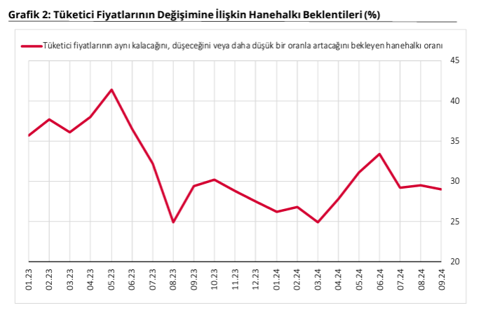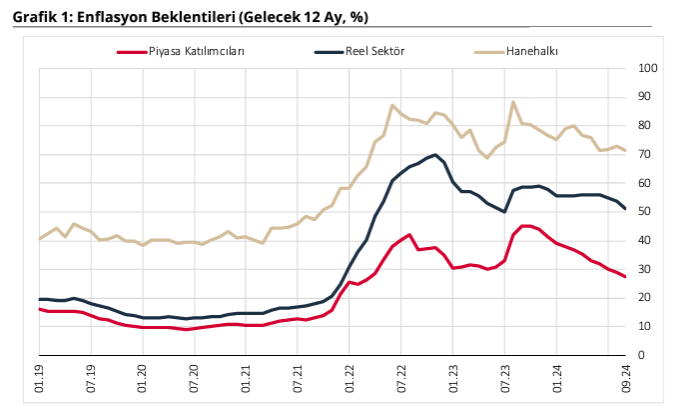 Türkiye Cumhuriyet Merkez Bankası (TCMB), piyasa katılımcıları, reel sektör ve hanehalkının 12 ay sonrası yıllık enflasyon beklentilerinin eylülde gerilediğini bildirdi. TCMB, Eylül 2024 "Sektörel Enflasyon Beklentileri"ni yayımladı. Piyasa Katılımcıları Anketi, İktisadi Yönelim Anketi ve Türkiye İstatistik Kurumu (TÜİK) iş birliğiyle yürütülen Tüketici Eğilim Anketi ile finansal ve reel sektör uzmanlarının, imalat sanayi firmalarının ve hanehalkının 12 ay sonrası yıllık tüketici enflasyonu beklentileri derlenerek Sektörel Enflasyon Beklentileri elde edildi. Buna göre eylülde 12 ay sonrası yıllık enflasyon beklentileri, piyasa katılımcıları için 1,2 puan azalarak yüzde 27,5 seviyesine, reel sektör için 2,7 puan azalarak yüzde 51,1 seviyesine, hanehalkı için 1,5 puan azalarak yüzde 71,6 seviyesine geriledi. Kaynak: TCMB - Sektörel Enflasyon Beklentileri Gelecek 12 aylık dönemde enflasyonun düşeceğini bekleyen hanehalkı oranı bir önceki aya göre 0,6 puan azalarak yüzde 29,0 seviyesinde gerçekleşti. Kaynak: TCMB - Sektörel Enflasyon Beklentileri [news_id:746930] [news_id:745720]