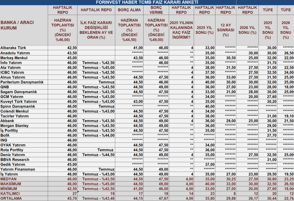 Merkez Bankası'nın gelecek hafta açıklayacağı faiz kararına yönelik hazırlanan beklenti anketi 27 ekonomistin katılımıyla sonuçlandı. İşte ankete katılan ekonomistlerin TCMB'ye ilişkin son tahminleri.. Türkiye Cumhuriyet Merkez Bankası (TCMB) Para Politikası Kurulu (PPK), Fatih Karahan başkanlığında 19 Haziran Perşembe günü toplanacak. PPK, aynı gün saat 14.00’te faiz kararını açıklayacak. Açıklanacak karar öncesinde ForInvest Haber’in beklenti anketine 27 ekonomist katılım sağladı. Ankete katılan ekonomistlerin 23’ü gösterge faizin sabit bırakılacağını, 4'ü ise haftalık repo faizinde indirim gerçekleşebileceğini öngördü. Ekonomistlerden 2'si haftalık repo faizinin 100 baz puan ile yüzde 45,00'e, 1'i 250 baz puan ile yüzde 43,50'ye, 1'i ise 350 baz puan indirim ile yüzde 42,50'ye indirileceğini tahmin etti. Kaynak: ForInvest Haber Marbaş Menkul Değerler Araştırma Uzman Yardımcısı Mustafa Kemal Eski ise özellikle koridor tarafında açık değişimlere gidilebileceğini öngördüklerini, politika faizinde esas indirimin temmuz ayı toplantısında gerçekleştirileceği görüşünde olduklarını kaydetti. TCMB'nin koridoru tekrar %46’lı seviyelere yönlendireceğini ve haftalık repo özelinde 100 baz puanlık bir indirime gideceğini tahmin eden Eski, "Politika faizi özelinde esas indirimin 250 baz puan ile temmuz ayındaki toplantıda yapılacağını değerlendirmek isteriz." diye konuştu. TCMB'nin TÜFE açısından başarılı bir noktaya geldiğini de aktaran Eski, "Enflasyon raporu 2.çeyrek sunumunda Mayıs ayı için %1,6 seviyesinde aylık TÜFE beklerken %1,53 geliyor oluşu elini güçlendirdi. TÜFE’nin önemli bir etken ve yönlendirici olduğunu her zaman olduğu gibi söylemeye devam ediyoruz. Ancak, 19 Mart 2025 itibariyle günümüze gündem olan 'swap harici net rezervler' de var. Eğer burada istenilen yönlendirme görülmezse aceleci davranmayacağını düşünüyoruz. Ancak şimdilik hem ekonomik hem siyasi hem küresel konjonktür, Türkiye’nin faiz indirim yönünde desteklendiği yönünde diyebiliriz." yorumunu yaptı. [news_id:774312]