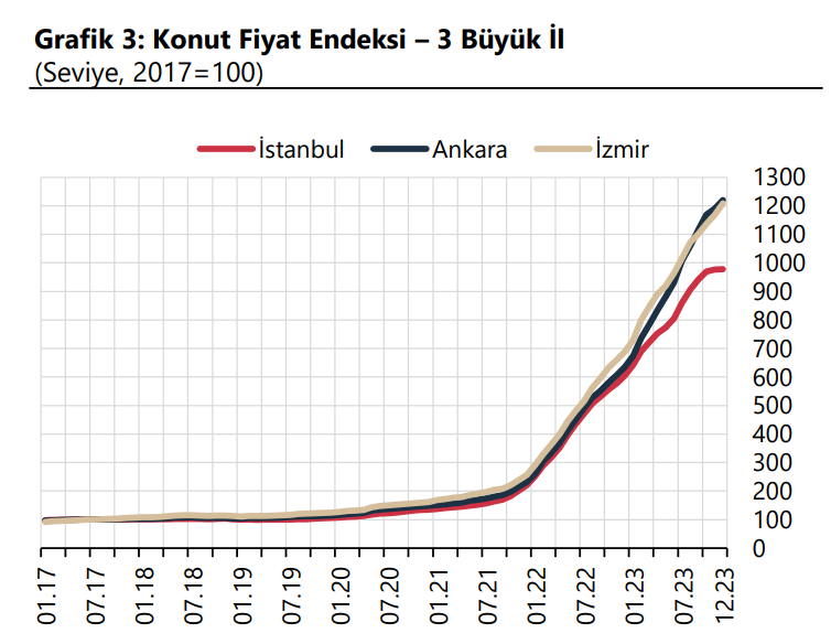 Konut Fiyat Endeksi (KFE), Aralık 2023'te aylık yüzde 1,1 ve yıllık yüzde 75,5 artışla 1163,2 oldu. Türkiye Cumhuriyet Merkez Bankası tarafından Aralık 2023 dönemine ilişkin Konut Fiyat Endeksi verileri açıklandı. Türkiye'deki konutların kalite etkisinden arındırılmış fiyat değişimlerini izlemek amacıyla hesaplanan KFE (2017=100), aralıkta bir önceki aya göre yüzde 1,1 artarak 1163,2 seviyesinde gerçekleşti. KFE, aralıkta yıllık bazda yüzde 75,5 artarken, bu dönemde reel yükseliş yüzde 7,1 oldu. Üç büyük il için KFE değişimine bakıldığında kasımda bir önceki aya göre İstanbul, Ankara ve İzmir'de sırasıyla yüzde 0,1, 2,5 ve 3,5 artış görüldü. Endeks değerleri bir önceki yılın aynı ayına göre ise İstanbul'da yüzde 61,8, Ankara'da yüzde 92,3, İzmir'de yüzde 75,6 yükseldi. Kaynak: TCMB - KFE [news_id:724511]