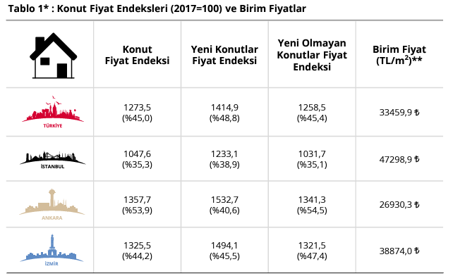 Merkez Bankası verilerine göre Konut Fiyat Endeksi (KFE), mayısta yıllık bazda yüzde 45 artarken, bu dönemde reel olarak yüzde 14,9 düşüş kaydetti. Türkiye Cumhuriyet Merkez Bankası tarafından Mayıs 2024 dönemine ilişkin Konut Fiyat Endeksi verileri açıklandı. Türkiye'deki konutların kalite etkisinden arındırılmış fiyat değişimlerini izlemek amacıyla hesaplanan KFE (2017=100), mayısta bir önceki aya göre yüzde 1,3 artarak 1273,5 oldu. KFE, mayısta yıllık bazda yüzde 45 artarken, bu dönemde reel olarak azalış yüzde 14,9 oldu. Üç büyük il için KFE değişimine bakıldığında nisanda bir önceki aya göre İstanbul için yüzde 1,1, Ankara için yüzde 2,4 ve İzmir için yüzde 2,6 artış görüldü. Endeks değerleri geçen yılın aynı ayına göre ise İstanbul'da yüzde 35,3, Ankara'da yüzde 53,9, İzmir'de yüzde 44,2 yükseldi. Kaynak: TCMB - Konut Fiyat Endeksi [news_id:739835] [news_id:739151]