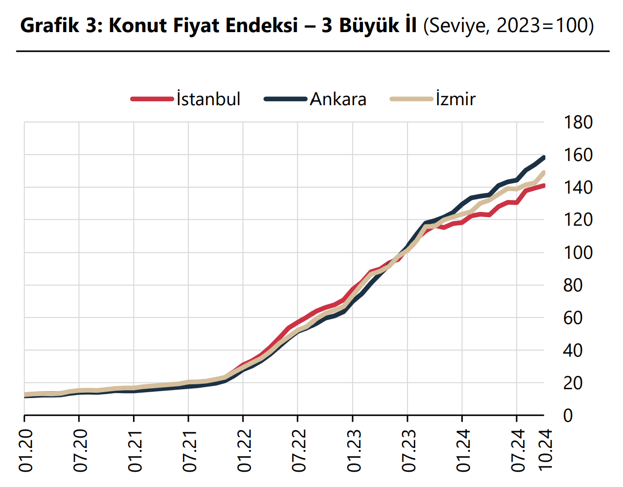 Merkez Bankası verilerine göre Konut Fiyat Endeksi (KFE), ekimde yıllık bazda yüzde 26,8 artarken, reel olarak yüzde 14,7 düşüş kaydetti. Türkiye Cumhuriyet Merkez Bankası tarafından Ekim 2024 dönemine ilişkin Konut Fiyat Endeksi verileri açıklandı. Türkiye'deki konutların kalite etkisinden arındırılmış fiyat değişimlerini izlemek amacıyla hesaplanan KFE (2023=100), ekimde bir önceki aya göre yüzde 2,1 artarak 151,1 oldu. Ekimde yıllık bazda yüzde 26,8 artan KFE, reel olarak ise yüzde 14,7 düşüş kaydetti. Kaynak: TCMB - Konut Fiyat Endeksi Üç büyük il için KFE değişimine bakıldığında ekimde bir önceki aya göre İstanbul için yüzde 1,1, Ankara için yüzde 2,8 ve İzmir için yüzde 4,5 artış görüldü. Endeks değerleri geçen yılın aynı ayına göre ise İstanbul'da yüzde 21,2, Ankara'da yüzde 32,5, İzmir'de yüzde 28,7 yükseldi. Kaynak: TCMB - Konut Fiyat Endeksi [news_id:752544] Hesaplama yönteminde revizyon yapılmıştı Türkiye Cumhuriyet Merkez Bankası (TCMB), Konut Fiyat Endeksi hesaplama yönteminde zamansallığı artıracak şekilde revizyon yaptığını duyurmuştu. Yeni serilerin zamansallığın artırılması amacıyla üç aylık veri seti yerine aylık veri seti kullanılarak hesaplanmaya başlandığı ve yayın süresinin t+45 yerine t+15 olarak güncellendiği belirtilen açıklamada, ek olarak, kullanılan modellerde ve ağırlıklandırma yönteminde de değişikliklerin yapıldığı, ayrıca serilerin baz yılının 2023 olarak değiştirildiği bildirilmişti. [news_id:752531]