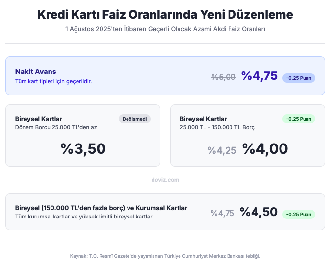 Türkiye Cumhuriyet Merkez Bankası (TCMB) faiz indiriminin ardından kredi kartı referans oranlarını belirlemede kullandığı baz puan tutarlarını aşağı yönlü güncelledi. Düzenlemenin ardından kredi kartlarına uygulanan faizlerde 25 baz puanlık indirim gerçekleşti. Türkiye Cumhuriyet Merkez Bankası tarafından hazırlanan ve kredi kartı işlemlerine dair faiz sınırlarını yeniden belirleyen tebliğ, “Kredi Kartı İşlemlerinde Uygulanacak Azami Faiz Oranları Hakkında Tebliğ'de Değişiklik Yapılmasına Dair Tebliğ” başlığıyla Resmî Gazete’de yayımlandı. Tebliğe göre dönem borcu 25 bin liranın altında kalan bireysel kart kullanıcıları için uygulanmakta olan azami akdi faiz oranı yüzde 3,5 düzeyinde sabit tutuldu. Bu grubun dışında kalan tüm grupların faiz oranlarında ise 25 baz puanlık indirime gidildi. Yüksek dönem borcu olan kartlara ve kurumsal kredi kartlarında indirilen faizler Buna göre nakit avans çekimlerinde uygulanan faiz oranı yüzde 5 seviyesinden yüzde 4,75’e çekildi. Aynı şekilde dönem borcu 25 bin lira ile 150 bin lira arasında bulunan bireysel kredi kartı kullanıcıları için daha önce uygulanmakta olan yüzde 4,25 oranındaki faiz, 25 baz puan indirilerek yüzde 4 seviyesine düşürüldü. Dönem borcu 150 bin lira üzerinde olan bireysel kredi kartı sahipleri ile dönem borcuna bakılmaksızın kurumsal kredi kartı kullanıcılarına uygulanan azami akdi faiz oranı ise yüzde 4,75’ten yüzde 4,50 seviyesine indirildi. Yeni faiz oranlarının ise 1 Ağustos'tan itibaren geçerli olacağı bildirildi. [news_id:779542]
