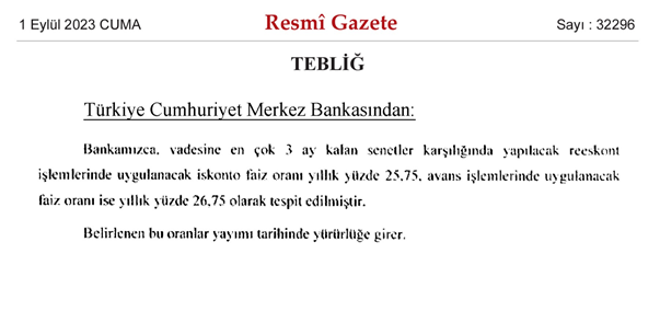 TCMB, Resmi Gazete'de yayımlanan karara göre, reeskont faiz oranında 10 puanlık artışa gitti. Böylece reeskont faizi yüzde 15,75'ten yüzde 25,75'e, avans faizi ise yüzde 16,75'ten yüzde 26,75'e yükseldi. Türkiye Cumhuriyet Merkez Bankası (TCMB) reeskont işlemlerinde uygulanacak iskonto faiz oranları ve avans işlemlerinde uygulanacak faiz oranlarıyla ilgili değişikliğe gitti. Resmi Gazete'de yayımlanan tebliğe göre, vadesine en çok 3 ay kalan senetler karşılığında yapılacak reeskont işlemlerinde uygulanacak iskonto faiz oranı yıllık yüzde 25,75 oldu. Avans işlemlerinde uygulanacak faiz oranı ise yıllık yüzde 26,75 olarak tespit edildi. Reeskont; iskonto edilmiş, diğer bir deyişle bir bedel karşılığı el değiştirmiş (iskonto) olan kıymetlerin, bir bedel karşılığında yeniden el değiştirmesini (reiskonto) ifade ediyor. Merkez Bankası, bankacılık kesiminin geçici likidite ihtiyaçlarının karşılanması için, bankalar tarafından verilecek ticari senet ve vesikaları reeskonta kabul edebiliyor. Türkiye’de reeskont işlemindeki tüm koşul ve kurallar, Merkez Bankası tarafından belirleniyor. Bu işlemler için Merkez Bankası tarafından uygulanan faize ise "reeskont faiz oranı" adı veriliyor. Merkez Bankası reeskonta kabul edebileceği senetler karşılığında avans da verebiliyor. Avans için teminat olarak alınan senetler ise ticari senet ve belgeler, devlet tahvilleri ve Borsada kayıtlı tahviller olarak gösteriliyor. Kaynak: Resmi Gazete [news_id:705058]