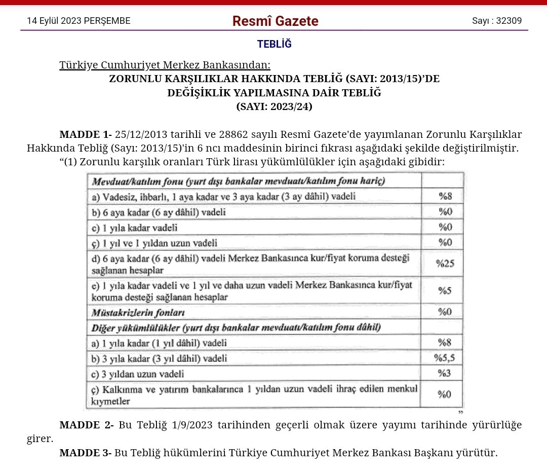 Merkez Bankası, Kur Korumalı Mevduat sistemine yönelik yeni kararını açıkladı. Buna göre piyasada oluşan TL likidite fazlasının zorunlu karşılık oran artışıyla sistemden çekilmeye devam edilmesi amaçlanarak, 6 ay vadeli KKM hesapları için zorunlu karşılıklar 10 puan artırıldı. Kur Korumalı Mevduat sistemiyle ilgili Merkez Bankası'ndan zorunlu karşılık kararı geldi. Türkiye Cumhuriyet Merkez Bankası'nın (TCMB) Zorunlu Karşılıklar Hakkında Tebliğ'de Değişiklik Yapılmasına Dair Tebliğ'i Resmi Gazete'de yayımlandı. Buna göre, Kur Korumalı Mevduatların zorunlu karşılık oranı vadeye göre farklılaştırılırken, KKM'nin yoğunlaştığı 6 aya kadar vadelinin zorunlu karşılık oranı 10 puan artırılarak yüzde 25’e yükseltildi. KKM'de 1 yıla kadar vadeli ve 1 yıl ve daha uzun vadeli olanlar için zorunlu karşılık oranı ise yüzde 5 olarak belirlendi. Daha önce kur korumalı hesaplarda zorunlu karşılık tesis etme yükümlülüğü tüm vadeler için yüzde 15'ti. Kaynak: Resmi Gazete Merkez Bankası'nın yeni adımı ile TL vadeli mevduatlar desteklenirken, KKM'de uzun vadenin öne çıkarılması hedefleniyor. Böylelikle bu hamle ile piyasada oluşan TL likidite fazlasının da sistemden çıkarılması planlanıyor. Son olarak Para Politikası Kurulu'nun 24 Ağustos 2023 tarihli toplantı özetinde ise faiz artırımının yanı sıra parasal sıkılaştırma sürecini destekleyecek seçici kredi ve miktarsal sıkılaştırma kararlarının alınmaya devam edileceği belirtilmişti. [news_id:705065]