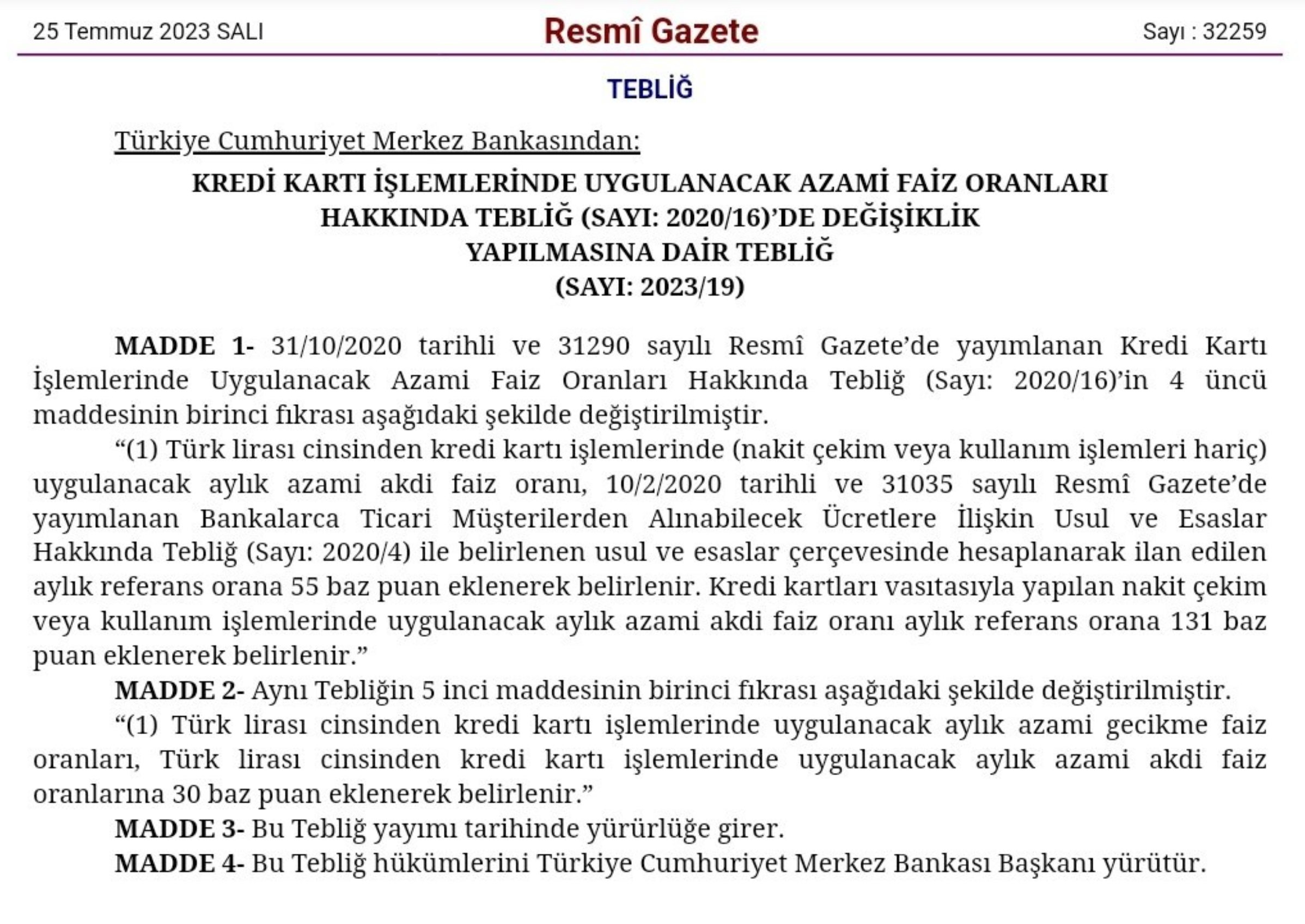 Türkiye Cumhuriyet Merkez Bankası'nın (TCMB) seçici kredi ve miktarsal sıkılaştırma adımları kapsamında yeni düzenlemeleri, Resmi Gazete'de yayımlanarak yürürlüğe girdi. Buna göre, ihracat ve yatırım kredileri ile deprem bölgesine yönelik krediler, Merkez Bankası'nın kredileri sınırlandırıcı tüm tedbirlerinin dışında tutuldu. Sıkılaşma sürecini destekleyen adımları tamamlayıcı olarak, kredi büyümesine göre menkul kıymet tesisi kapsamında yüzde 3 olan TL ticari krediler için aylık büyüme sınırının yüzde 2,5 olarak belirlenmesine karar verildi. İhracat, yatırım, tarım ve esnaf kredileri, bu sınırlandırmanın dışında tutuldu. Piyasa mekanizmasının işlevselliğini artırmak için faiz oranına göre menkul kıymet tesisi uygulaması sadeleştirildi. Buna göre, ihracat ve yatırım kredileri hariç TL ticari kredilerde birinci kademe kaldırılarak faiz sınırı tek kademe olarak uygulanacak. İhtiyaç kredilerinde değişikliğe gidilmedi Finansal kaynakların verimli kullanımının desteklenmesi amacıyla taşıt kredilerinde yüzde 3 olan büyüme sınırının yüzde 2 olarak belirlenmesine, ihtiyaç kredilerinde ise değişikliğe gidilmeyerek yüzde 3 sınırının korunmasına karar verildi. Enflasyon kontrolü ve iç talebin dengelenmesine yönelik kararlar yürürlükte Ayrıca, enflasyonun kontrolü ve iç talebin dengelenmesi kapsamında kredi kartı nakit kullanımlarına ve kredili mevduat hesaplarına uygulanan aylık azami faiz oranı yüzde 2,89'a yükseltildi. Söz konusu oran, 25 Temmuz'da Merkez Bankası'nın resmi internet sitesinde yayımlanarak 1 Ağustos 2023'ten itibaren geçerli olacak. İhracatçıların finansmana erişimi kolaylaştırılarak ihracat desteği artırıldı Merkez Bankası, ayrıca, ihracatçıların finansmana erişimini desteklemek ve ihracat desteğini artırmak amacıyla aldığı kararları da duyurdu. Buna göre, reeskont kredilerinin günlük limiti 1,5 milyar TL'ye yükseltildi. Reeskont kredilerinde KOBİ payının artırılmasına ve kullandırımlarda ihracat artış performansının dikkate alınmasına karar verildi. Sadeleşme süreci kapsamında reeskont kredilerine erişim şartları kolaylaştırıldı. Reeskont kredisi kullanımında yüzde 30 ilave ihracat bedeli satış koşulu kaldırıldı. Reeskont kredi vadesi boyunca verilen döviz almama taahhüdünden, ithalat ödemeleri kapsamındaki döviz alımları istisna tutuldu.