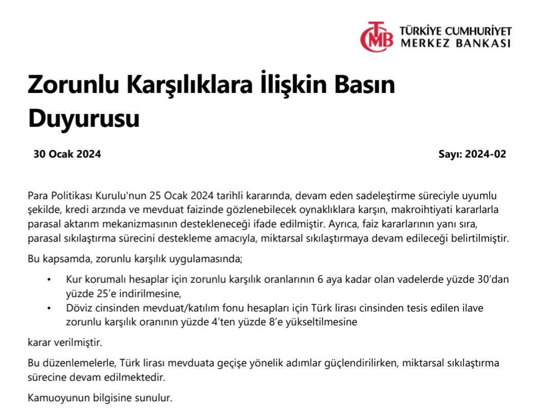 TCMB, zorunlu karşılık oranlarında değişikliğe gitti. Resmi Gazete'de yayımlanan kararla, kur korumalı hesaplar (KKM) için zorunlu karşılık oranı, 6 aya kadar vadede yüzde 30'dan yüzde 25'e indirilirken; döviz cinsinden hesaplarda ise yüzde 4'ten yüzde 8'e yükseltildi. TCMB'nin Zorunlu Karşılıklar Hakkında Tebliğ'de Değişiklik Yapılmasına Dair Tebliği Resmi Gazete'de yayımlandı. Buna göre, zorunlu karşılık uygulamasında; piyasa mekanizmalarının işlevselliğini artıracak, makro finansal istikrarı güçlendirecek ve miktarsal sıkılaştırma yoluyla parasal aktarımın desteklenmesini sağlayacak değişikliler yapılması kararı alındı. Bu kapsamda, kur koruması sağlanan hesaplar için zorunlu karşılık oranlarının 6 aya kadar olan vadelerde yüzde 30'dan yüzde 25'e indirilmesine, yabancı para cinsinden mevduat/katılım fonu (yurt dışı bankalar mevduatı/katılım fonu ve kıymetli maden depo hesapları hariç) için tüm vadelerde TL cinsinden tesis edilen ilave zorunlu karşılık oranının yüzde 4'ten yüzde 8'e yükseltilmesine karar verildi. Söz konusu düzenlemelerle TL mevduata geçişe yönelik adımlar güçlendirilirken, miktarsal sıkılaştırma sürecine devam edildiği belirtildi. Kaynak: TCMB Para Politikası Kurulu'nun 25 Ocak 2024 tarihli kararında ise devam eden sadeleştirme süreciyle uyumlu şekilde kredi arzında ve mevduat faizinde gözlenebilecek oynaklıklara karşın makroihtiyati kararlarla parasal aktarım mekanizmasının destekleneceği belirtilirken, sterilizasyon araçlarının çeşitliliği artırılarak miktarsal sıkılaştırmaya devam edileceği bildirilmişti. [news_id:722141]