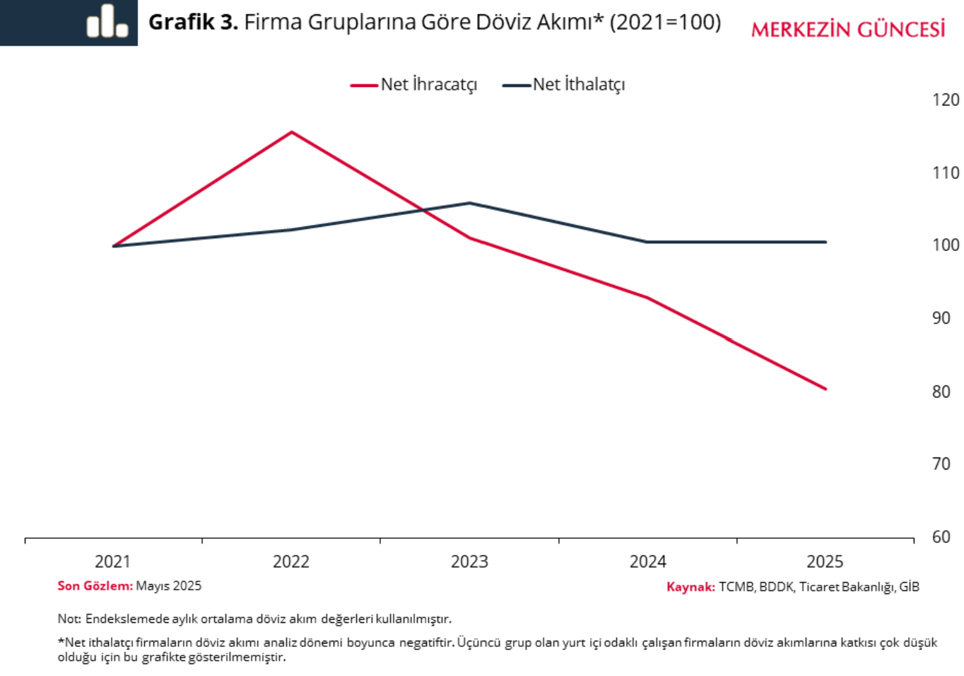 Türkiye Cumhuriyet Merkez Bankası'nın (TCMB) Merkezin Güncesi adlı blogundaki son analizde, reel sektörün döviz talebi gelişmeleri değerlendirildi. Merkez Bankası, reel sektörün döviz talebini analiz etti. Merkezin Güncesi'ndeki blog yazısında, net ithalatçı firmaların uzun dönem ortalamasına yakın bir döviz talebi sergilediği belirtilerek, "Yakın dönemde görülen döviz alımlarında da net ithalatçı firmaların dış ticaret ödemeleri belirleyici oluyor" denildi. Analize göre, parasal sıkılaşma ile birlikte, firmaların yabancı para mevduat oranı, 2023 yılı haziran ayındaki yüzde 60,7 seviyesinden gerileyerek 2025 yılı haziran ayı itibarıyla yüzde 35 seviyesine düştü. 2021 Ocak-2025 Mayıs dönemindeki döviz akımı gelişmeleri ise firmaların döviz gelirlerini biriktirme eğiliminin zayıfladığına işaret etti. Analizde konuya ilişkin şu ifadelere yer verildi: "Döviz akımının seyri firmaların döviz talebinin zaman içerisinde azaldığını ve reel sektörün son bir yılda net döviz satıcısı konumuna geldiğini gösteriyor. Net ihracatçı firmalar finansal sisteme döviz arz ederken net ithalatçı firmalar uzun dönem ortalamasına yakın bir döviz talebi sergiliyor. Yakın dönemde görülen döviz alımlarında da net ithalatçı firmaların dış ticaret ödemeleri belirleyici oluyor." [news_id:782096]