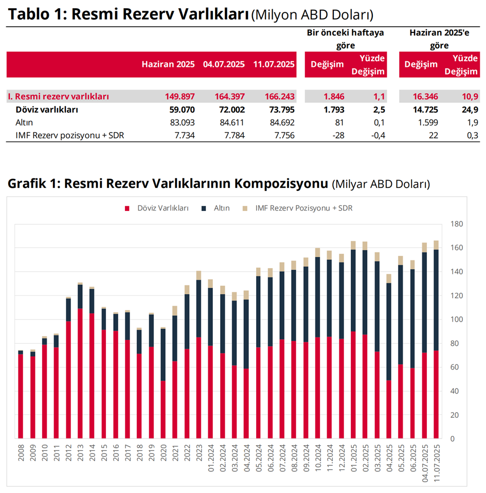 Türkiye Cumhuriyet Merkez Bankası'nın rezervleri 11 Temmuz itibarıyla %1,1 artarak 166,2 milyar dolara yükseldi. Türkiye Cumhuriyet Merkez Bankası’nın (TCMB) Uluslararası Rezervler ve Döviz Likiditesi verileri yayımlandı. TCMB haftalık verilerine göre 11 Temmuz itibarıyla toplam rezervler yüzde 1,1 artışla 166,2 milyar dolara yükseldi. İlgili dönemde döviz varlıkları bir önceki haftaya göre %2,5 artarak 73,8 milyar dolar, altın cinsinden rezerv varlıkları %0,1 artarak 84,7 milyar dolar, IMF rezerv pozisyonu ve SDR toplamı ise %0,4 azalarak 7,7 milyar dolar oldu. Kaynak: TCMB [news_id:778532]