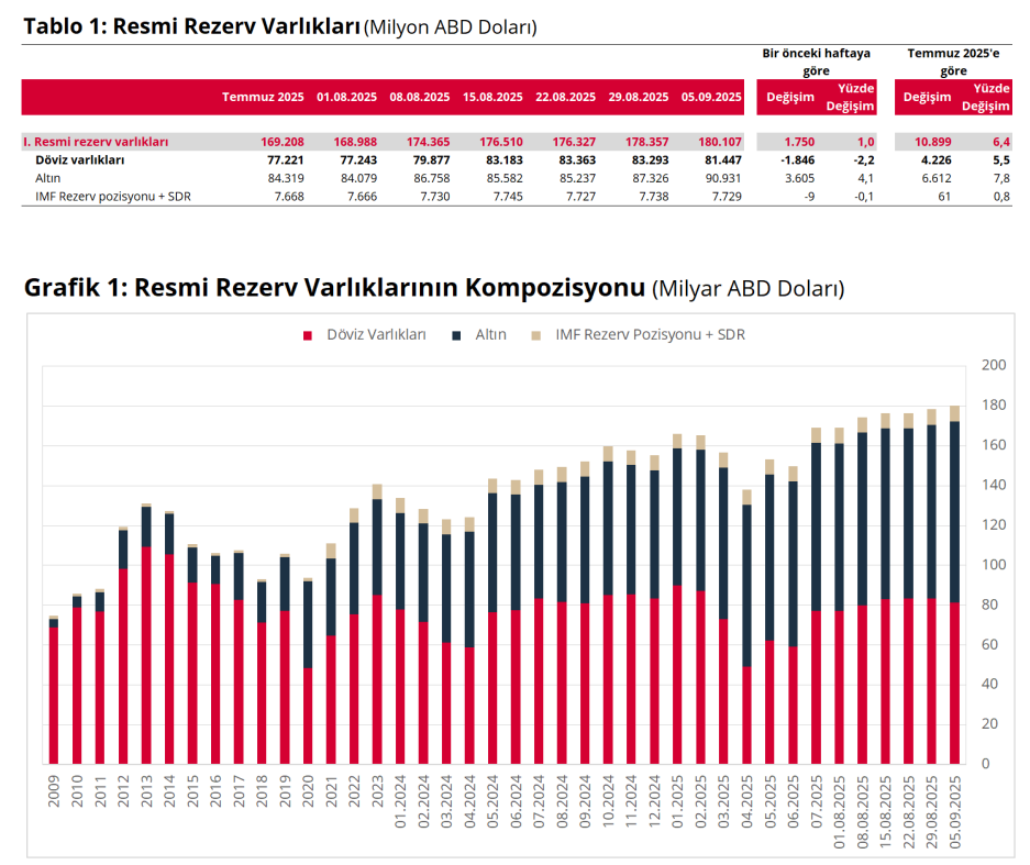 Türkiye Cumhuriyet Merkez Bankası'nın toplam rezervleri 5 Eylül haftasında 180,1 milyar dolara çıkarak tüm zamanların yeni zirvesine ulaştı. Türkiye Cumhuriyet Merkez Bankası’nın (TCMB) Uluslararası Rezervler ve Döviz Likiditesi verileri yayımlandı. TCMB haftalık verilerine göre 5 Eylül itibarıyla toplam rezervler yüzde 1 artarak 180,1 milyar dolara çıktı. İlgili haftada döviz varlıkları bir önceki haftaya göre %2,2 azalarak 81,4 milyar dolar, altın cinsinden rezerv varlıkları %4,1 artarak 90,9 milyar dolar, IMF rezerv pozisyonu ve SDR toplamı ise %0,1 azalarak 7,7 milyar dolar oldu. Merkez Bankası rezervleri son olarak 29 Ağustos haftasında 178,4 milyar dolarla rekor kırmıştı. Böylelikle rezervler üst üste ikinci haftada rekor tazelemiş oldu. Kaynak: TCMB [news_id:784536]