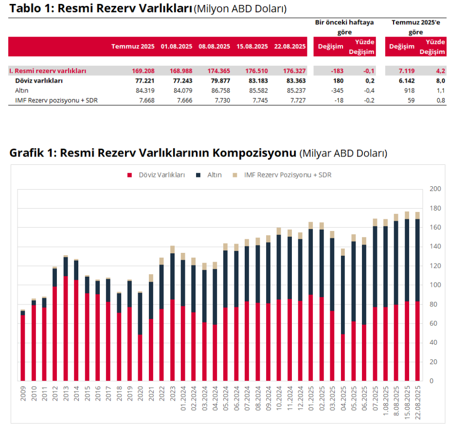 Türkiye Cumhuriyet Merkez Bankası'nın toplam rezervleri 22 Ağustos haftasında 183 milyon dolar azalarak 176,3 milyar dolara indi. Türkiye Cumhuriyet Merkez Bankası’nın (TCMB) Uluslararası Rezervler ve Döviz Likiditesi verileri yayımlandı. TCMB haftalık verilerine göre 22 Ağustos itibarıyla toplam rezervler yüzde 0,1 azalarak 176,3 milyar dolara indi. İlgili haftada döviz varlıkları bir önceki haftaya göre %0,2 artarak 83,4 milyar dolar, altın cinsinden rezerv varlıkları %0,4 azalarak 85,2 milyar dolar, IMF rezerv pozisyonu ve SDR toplamı ise %0,2 azalarak 7,7 milyar dolar oldu. Merkez Bankası rezervleri son olarak 15 Ağustos haftasında 176,5 milyar dolarla rekor tazelemişti. Kaynak: TCMB