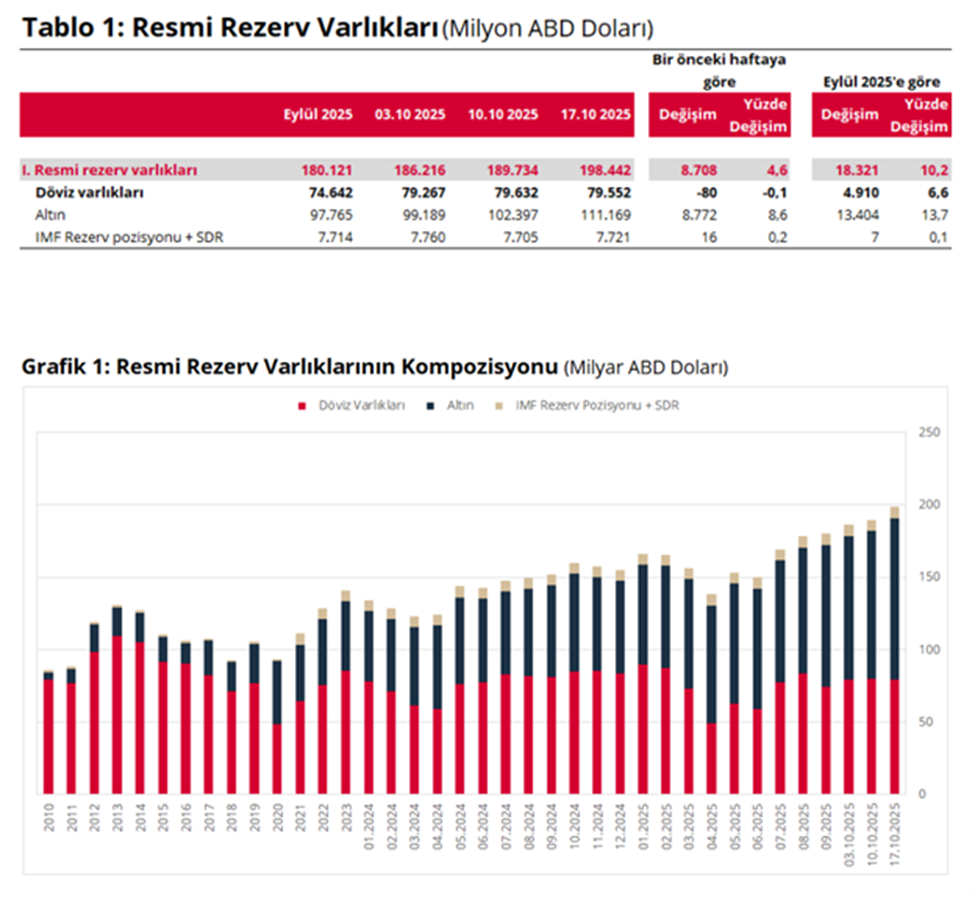 Türkiye Cumhuriyet Merkez Bankası'nın toplam rezervleri 17 Ekim haftasında 198,4 milyar dolara yükselerek tüm zamanların rekorunu kırdı. Türkiye Cumhuriyet Merkez Bankası’nın (TCMB) Uluslararası Rezervler ve Döviz Likiditesi verileri yayımlandı. TCMB haftalık verilerine göre 17 Ekim itibarıyla toplam rezervler yüzde 4,6 artarak 198,4 milyar dolara çıktı. İlgili haftada döviz varlıkları bir önceki haftaya göre %0,1 azalarak 79,6 milyar dolar, altın cinsinden rezerv varlıkları %8,6 artarak 111,2 milyar dolar, IMF rezerv pozisyonu ve SDR toplamı ise %0,2 artarak 7,7 milyar dolar oldu. Merkez Bankası rezervleri son olarak 10 Ekim haftasında 189,7 milyar dolarla rekor kırmıştı. Kaynak: TCMB Cibre: TCMB, 2022’den beri altında nette alıcı Rezervlerdeki yükselişin ortasında Merkez Bankası’nın ekim ayında 2,5 ton altın sattığı iddiaları basına yansımıştı. Pusula Portföy Yönetim Kurulu Danışmanı İris Cibre ise altın satışı iddialarının gerçeği yansıtmadığını belirterek şunları aktarmıştı: “Merkez Bankası Altın Satmadı Merkezin net altını aslında 14,94 ton arttı! Detaya girip hesapladım; Nasıl düşmüş görünüyor anlatayım. Merkez Bankasının haftalık vaziyette açıkladığı 2.5 ton düşen rakam brüt altın rezervi. Yani, yükümlülükler düştüğünde brüt rezerv düştüğünden, 2,5 ton altın satılmış gibi görünüyor. Düşen yükümlülükler; Bankacılık sektörü altın mevduatı ve dolayısıyla da altın zorunlu karşılıkları, toplam 17,44 TON düşüyor. Sonuç olarak, netleştirince brüt rezerv de 2,5 ton düşmüş oluyor. Sonuç itibarıyla TCMB, 2025'te nette 41,4 ton altın almış. 2022'den beri de nette alıcı.” [news_id:789374]