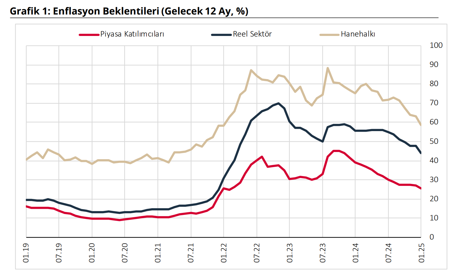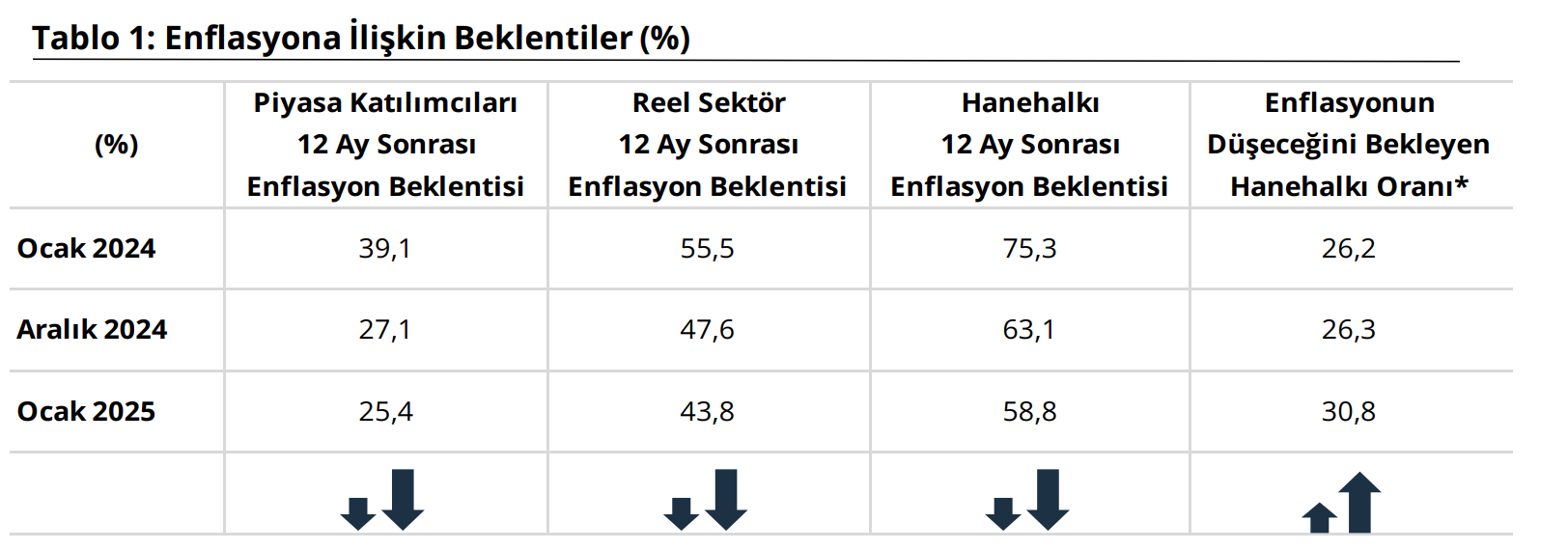 Türkiye Cumhuriyet Merkez Bankası (TCMB), piyasa katılımcıları, reel sektör ve hanehalkının ocak ayında 12 ay sonrasına ilişkin enflasyon beklentilerini açıkladı. TCMB, Ocak 2025 dönemine ilişkin "Sektörel Enflasyon Beklentileri"ni yayımladı. Piyasa Katılımcıları Anketi, İktisadi Yönelim Anketi ve Türkiye İstatistik Kurumu (TÜİK) iş birliğiyle yürütülen Tüketici Eğilim Anketi ile finansal ve reel sektör uzmanlarının, imalat sanayi firmalarının ve hanehalkının 12 ay sonrası yıllık tüketici enflasyonu beklentileri derlenerek Sektörel Enflasyon Beklentileri elde edildi. Buna göre 2025 yılı Ocak ayında 12 ay sonrası yıllık enflasyon beklentileri, piyasa katılımcıları için 1,7 puan azalarak yüzde 25,4 seviyesine, reel sektör için 3,8 puan azalarak yüzde 43,8 seviyesine, hanehalkı için 4,3 puan azalarak yüzde 58,8 seviyesine geriledi. Kaynak: TCMB - Sektörel Enflasyon Beklentileri Gelecek 12 aylık dönemde enflasyonun düşeceğini bekleyen hanehalkı oranı bir önceki aya göre 4,5 puan artarak yüzde 30,8 seviyesinde gerçekleşti. Kaynak: TCMB - Sektörel Enflasyon Beklentileri [news_id:759546]