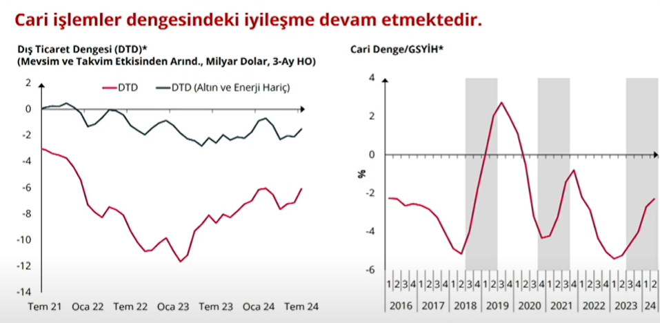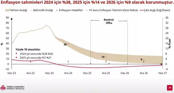 Türkiye Cumhuriyet Merkez Bankası (TCMB), enflasyon tahminlerinde değişikliğe gitmediğini duyurdu. Buna göre 2024 sonu tahmini yüzde 38, 2025 tahmini yüzde 14, 2026 tahmini ise yüzde 9 seviyesinde sabit kaldı. TCMB Başkanı Fatih Karahan, yılın üçüncü enflasyon raporunu açıkladı. Başkan Karahan'ın açıklamalarından öne çıkanlar şöyle oldu: "Bir önceki rapor döneminden bu yana değişmeyen tek unsur, para politikasındaki kararlı duruşumuz. İlerleyen dönemde de bu duruşumuzu sürdürerek, dezenflasyonun devamını sağlayacak şekilde hareket edeceğiz. Dezenflasyon süreci öngördüğümüz şekilde başladı. Makro göstergeler bu süreçle uyumlu ilerliyor. Sıkı para politikası duruşu sonucunda kredi büyümesinde yavaşlama belirginleşti. Yurt içi talep ikinci çeyrekten bu yana azalmakta. Talepteki dengelenme güçlenerek devam edecek. Cari işlemler açığında düşüş sürüyor. Para politikasında kararlı duruşu sürdürerek dezenflasyonu sağlayacak şekilde hareket edeceğiz. Küresel büyümede 2024'te sınırlı, 2025'te ise daha belirgin bir artış öngörülüyor. Merkez bankalarının indirim süreçlerinde temkinli olmaları beklenmektedir. Ilımlı büyüme ve enflasyon görünümü önümüzdeki dönemde parasal sıkılığın azalacağına işaret ediyor. "Yurt içi talep ikinci çeyrekte yavaşladı" İlk çeyrekte büyümede daha dengeli bir talep görünüm izledi. Üçüncü çeyreğe ilişkin öncü göstergeler iç talepte normalleşmenin devamına işaret ediyor. Kartlı harcamalar yüksek olmakla birlikte son dönemde görece yatay seyretti. Kart harcamaları, beyaz eşya ve otomobil satışları iç talepteki yavaşlamayı teyit ediyor. Kuyumculuk, elektronik ve araç kiralama gibi harcamalar son dönemde azaldı. Arz koşulları talepteki görünümle uyumlu. Yurt içi talebin ikinci çeyrekte yavaşladığını değerlendiriyoruz. Sıkı para politikası sonucu iç talepteki dengelenme devam edecek. Çıktı açığı dezenflasyon sürecinin önemli bir bileşeni olacaktır. İkinci çeyrekte cari açığın milli gelire oranının yüzde 2,5'in altına gerilediğini tahmin ediyoruz. Temmuz ayında cari açığın 20 milyar dolar civarına inmesini bekliyoruz. Önümüzdeki dönemde sıkı parasal duruşumuzla uyumlu olarak cari dengede olumlu seyrin süreceğini öngörüyoruz. Kaynak: TCMB "Tüm sektörlerin enflasyon beklentisinde düşüş öngörüyoruz" Yıllık enflasyon tepe nokta olan mayıs sonrası iki ay düşüş sergiledi. Enflasyonun ana eğilimindeki yavaşlamanın sürdüğünü görüyoruz. Enflasyonun ana eğilimindeki zayıflama öngörülerimizle uyumlu seyretti. Temmuzda ana eğilim sınırlı bir artış gösterdi. Yavaşlamanın sürdüğünün altını çizmek gerekiyor. Enflasyon temmuzda geçici olarak arttı. Dezenflasyon sürecinde hizmetlerde yavaşlama gecikmeli olarak ortaya çıkıyor. Öncü göstergeler kira enflasyonunda önümüzdeki aylarda düşüşe işaret ediyor. Dayanıklı mallarda fiyat artışları sınırlı gerçekleşti, hatta bazılarında fiyat düşüşü izlemeye başladık. Enflasyon beklentileri yüksek seyretmekle birlikte geriliyor. Manşet enflasyondaki düşüşle tüm sektörlerin beklentilerinin gerileyeceğini öngörüyoruz. "Likidite fazlasını sterilize etmeye devam edeceğiz" Sıkı parasal duruş korunuyor. Makroihtiyati politikaları uygulamaya devam ediyoruz. Mayıs ayında TL zorunlu karşılık oranlarını artırarak likidite fazlasını sterilize ettik. Kredi piyasasında ticari kredi azami erken ödeme ücretlerini güncelledik. Likidite fazlasını sterilize ediyoruz. Önümüzdeki dönemde diğer para piyasalarında işlem yapmaya başlayarak likidite fazlasını sterilize etmeye devam edeceğiz. Finansal koşullarda sıkılık devam etmektedir. Para politikası duruşumuz mevduat faizlerinin TL'ye geçişi sürdürecek seviyede kalmasını sağlayacak. Tüketici kredilerinde büyüme ikinci çeyrekten itibaren zayıfladı. Ticari kredi büyümesi yavaşladı. Reel kredi maliyetleri artıyor ve firmaların kredi iştahı azalıyor. Firmalar daha az miktarda kredi kullanıyor. Sıkı duruşumuz TL varlıklara ilgili artırdı. Mart ayında mevduatın payı yüzde 50'yi aştı. TL mevduat payı yıl sonu hedefimizi aştı. TL mevduat payında artış devam edecek. [news_id:740875] Risk primi ılımlı seyrini sürdürüyor. Portfiy girişleri ağırlıklı olarak DİBS piyasasında yoğunlaştı. Parasal sıkılaştırma süreci rezervlere olumlu yansıyor. Brüt rezerv düzeyimiz 150 milyar doları üzerine çıkıt. Swap hariç rezervler 28,6 milyar dolara yükseldi. TCMB'nin enflasyon tahmini 2024, 2025 ve 2026 tahminlerinde değişikliğe gitmedik. Enflasyonun yıl sonunda yüzde 38 seviyesine gerileyeceğini öngördük. 2025 ve 2026 yılı tahminlerini de sırasıyla yüzde 14 ve yüzde 9 seviyesinde koruduk. Orta vadede ise enflasyonun yüzde 5’te istikrar kazanmasını hedefliyoruz. Tahmin aralıklarının alt ve üst noktaları da 2024 yılı için yüzde 34 ve 42 arasında koruduk. Kaynak: TCMB Para politikasındaki kararlı duruşumuz, yurt içi talepte dengelenme, Türk Lirası'nda reel değerlenme ve enflasyon beklentilerindeki düzelme vasıtasıyla aylık enflasyonun ana eğilimini düşürmeye devam edecektir. Para politikasındaki temkinli duruşun sürdürülmesiyle, enflasyonun yılın kalanında da istikrarlı olarak gerileyeceğini öngörüyoruz. Para politikasındaki sıkı duruşumuzu fiyat istikrarı sağlanana kadar kararlılıkla sürdüreceğiz. Haziranda başlayan dezenflasyon sürecinde, enflasyonu, belirlediğimiz ara hedeflerle uyumlu olacak şekilde düşürmek için ne gerekiyorsa yapmaya devam edeceğiz."
