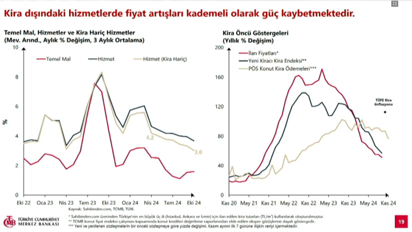 TCMB Başkanı Fatih Karahan, 2024 ve 2025 yıllarına ilişkin enflasyon tahminlerini sırasıyla yüzde 44 ve yüzde 21 seviyesine çıkardıklarını duyurdu. Yılın 3. Enflasyon Raporu toplantısında 2024 sonunda enflasyonun yüzde 38'e gerileyeceğini öngören TCMB Başkan Fatih Karahan, "Enflasyon Raporu 2024-IV"ün tanıtımı amacıyla TCMB İdare Merkezi'nde bilgilendirme toplantısı düzenledi. Bilgilendirme toplantısında enflasyonda yeni öngörülerini de açıklayan Karahan, 2024 ve 2025 enflasyon tahminlerinin yüzde 44 ve yüzde 21 olarak yukarı yönlü güncellendiğini, 2026 sonunda ise enflasyonun yüzde 12'ye gerilemesinin beklendiğini bildirdi. Başkan Karahan'ın burada yaptığı açıklamalardan öne çıkanlar ise şöyle oldu: "Dezenflasyon süreci devam ediyor. Enflasyonun ana eğilimi öngörülerimizden yavaş olsa da iyileşiyor. Makroekonomik göstergeler de dezenflasyon süreciyle uyumlu ilerliyor. İç talebin yavaşlamaya devam ederek enflasyonu destekleyici seviyelere geldiğini değerlendiriyoruz. Cari işlemler açığında düşüş sürüyor. Para politikasındaki sıkı duruşumuzu dezenflasyonun devamını sağlayacak şekilde sürdüreceğiz. Küresel büyüme görünümünde kademeli toparlanma öngörüsü korundu. Bununla birlikte aşağı yönlü risklerin ağırlık kazandığını düşünüyoruz. Öncü göstergeler özellikle imalat sanayisinde aşağı yönlü risklerin arttığını gösteriyor. Jeopolitik gelişmeler enerji fiyatlarındaki oynaklığı artırdı. Enflasyon görünümüne bağlı olarak gelişmiş ülkeler faiz indirimlerine başladı. Gelişmekte olan ülkelerde ise yeni bankaların sürece dahil olduğunu görüyoruz. Küresel enflasyondaki atalet zayıflamakla birlikte devam ediyor. Bununla birlikte bazı merkez bankalarının faiz artırdığını gözlemliyoruz. Yurt içi görünüme göre talepteki dengelenme süreci devam ediyor. Büyümedeki talep kompozisyonu daha dengeli bir görünüm sergiliyor. Üçüncü çeyreğe ilişkin mevcut veriler yurt içi talepte ılımlı seyrin devam ettiğini gösteriyor. Arz göstergeleri ise iktisadi faaliyette yavaşlamaya işaret ediyor. Çıktı açığı üçüncü çeyrekte gerilemeyi sürdürürken çıktı açığında gerilemenin yılın son çeyreğinde de devam ettiğini değerlendiriyoruz. Sıkı para politikamız sonucunda iç talepteki dengelenme sürecektir.. Enflasyon görünümü Enflasyon beklentilerinde iyileşme kademeli olarak devam ediyor. Ekim ayında enflasyonun ana eğilimindeki düşüş sürdü. Enflasyonun ana eğilimindeki iyileşme temel mallar öncülüğünde devam etti. Geçmişe endeksleme eğilimi güçlü kalemler hizmet enflasyonunu yukarı çekiyor. Hizmet enflasyonu üzerinde okula dönüş etkili oldu. Kira dışındaki hizmetlerde fiyat artışları kademeli olarak güç kaybetmektedir. Veriler, son çeyrekte aylık kira enflasyonun yavaşlayacağına işaret ediyor. Kaynak: TCMB "Fiyat artışlarının genele yayılımı azalıyor" Sanayi sektöründe firmaların fiyatlama davranışları iyileşiyor. Üretici enflasyonundaki seyir TÜFE'de mal fiyatlarını olumlu etkiliyor. Temel mallarda fiyat artışları önemli ölçüde zayıfladı. Genel itibarıyla temel mal enflasyonu düşük seyretmeye devam ediyor. Talep koşullarındaki zayıflamayla fiyat artışının genele yayılımı azalıyor. Tüm sektörlerin enflasyon beklentileri kademeli bir şekilde geriliyor ancak enflasyon beklentilerindeki iyileşmenin hızı henüz arzu ettiğimiz gibi değil. Sıkı para politikası duruşumuzla beklentilerin dezenflasyon sürecine katkı verecek şekilde oluşmasını sağlamakta kararlıyız. Sıkı parasal duruş makroihtiyati adımlarla destekleniyor. Araç setimizi etkili bir şekilde kullanmaya devam edeceğiz. Para politikası duruşumuz ve makroihtiyati çerçevemiz mevduat faizlerinin TL'ye geçişi ve tasarrufları destekleyici seviyelerde kalmasını sağlayacak. TL varlıklara olan ilgi arttı. TL mevduatın payı yüzde 56 seviyesine ulaştı, KKM payı yüzde 8'in altına indi. TCMB'nin enflasyon tahmini 2024 ve 2025 tahminlerinimizi sırasıyla yüzde 44 (önceki yüzde 38) ve yüzde 21 (Önceki yüzde 14) olarak yukarı yönlü güncelledik. 2026 sonunda ise enflasyonun yüzde 12'ye gerileyeceğini öngörüyoruz. 2024 yılına ilişkin tahmin aralığını da yüzde 34-42 bandından yüzde 42-46 bandına çıkardık. Enflasyonun orta vadede ise %5 hedefine yakınsayarak istikrar kazanacağını tahmin ediyoruz. Para politikasındaki temkinli duruşun sürdürülmesiyle yıllık enflasyonun önümüzdeki dönemde istikrarlı olarak gerileyeceğini öngörüyoruz." Kaynak: TCMB