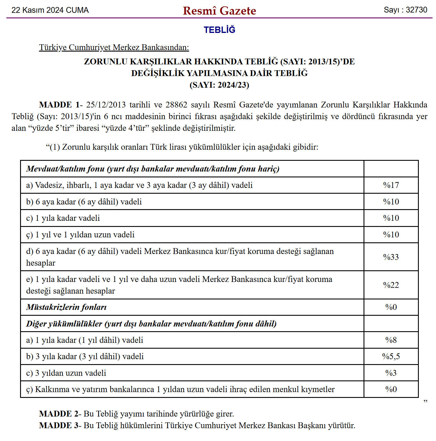 Türkiye Cumhuriyet Merkez Bankası (TCMB), artan Türk lirası (TL) mevduat payını göz önünde bulundurarak bazı sadeleşme adımları attı. TCMB'nin, Resmi Gazete'nin bugünkü sayısında yayımlanan "Zorunlu Karşılıklar Hakkında Tebliğ'de Değişiklik Yapılmasına Dair Tebliğ"e ilişkin duyurusuna göre, Merkez Bankası, artan TL mevduat payını göz önünde bulundurarak bazı sadeleşme adımlarının atılmasına karar verdi. TL mevduat hesaplarına uygulanan zorunlu karşılık oranları ile yabancı para (YP) mevduat için TL cinsinden tesis edilmesi gereken zorunlu karşılık oranı değiştirildi. Buna göre, kısa vadeli TL mevduatta yüzde 15 olan oran yüzde 17'ye çıkarılırken, YP mevduat için TL tesis oranı da yüzde 5'ten yüzde 4'e indirildi. Zorunlu karşılıkların ise 6 Aralık 2024'te tesis edileceği bildirildi. Kaynak: Resmi Gazete Öte yandan Tüzel kişi TL mevduat payı hedefi de kaldırıldı. Kur korumalı mevduatın (KKM) TL'ye geçişine ve yenilenmesine ilişkin toplam hedef ise yüzde 75'ten yüzde 70'e indirildi. [news_id:753443]