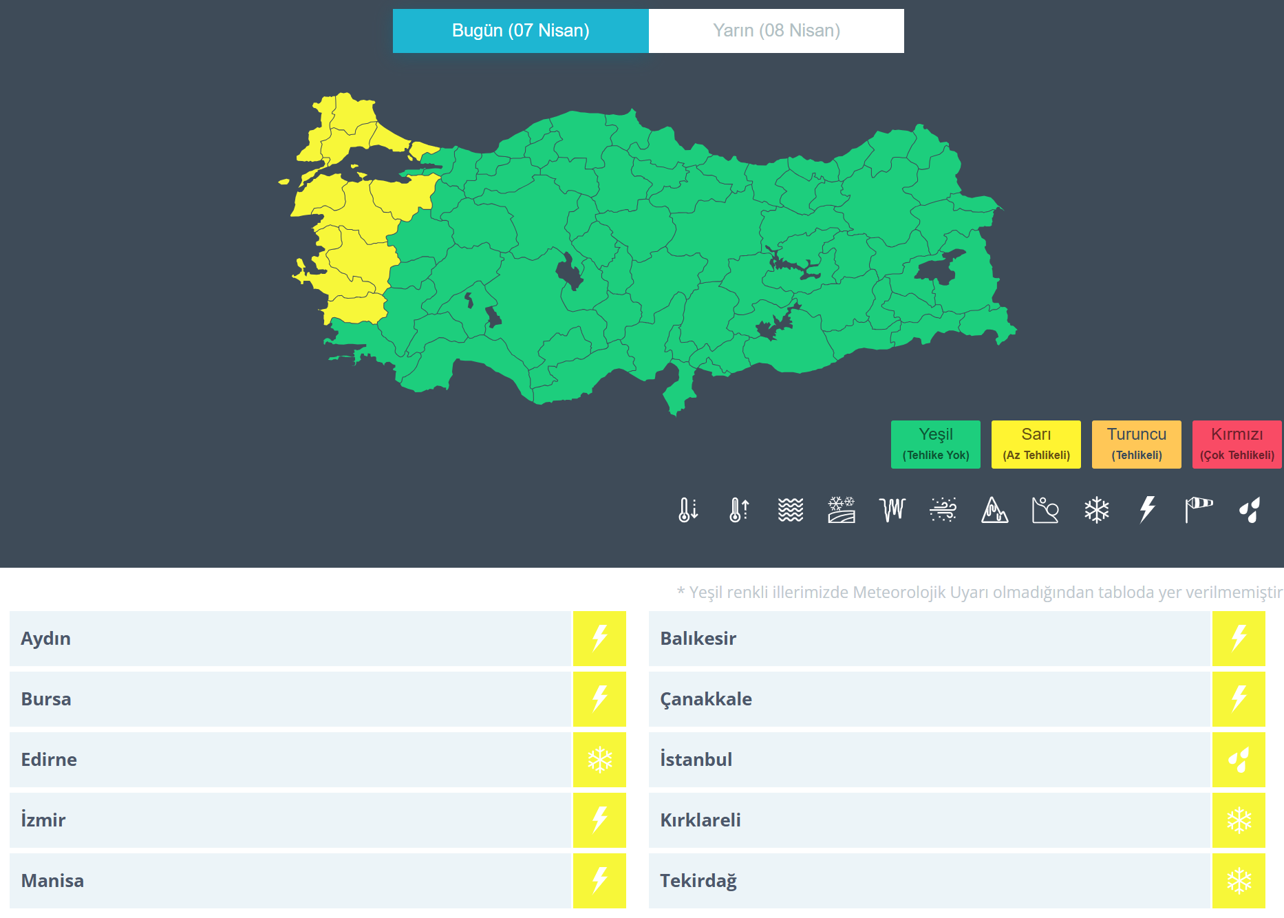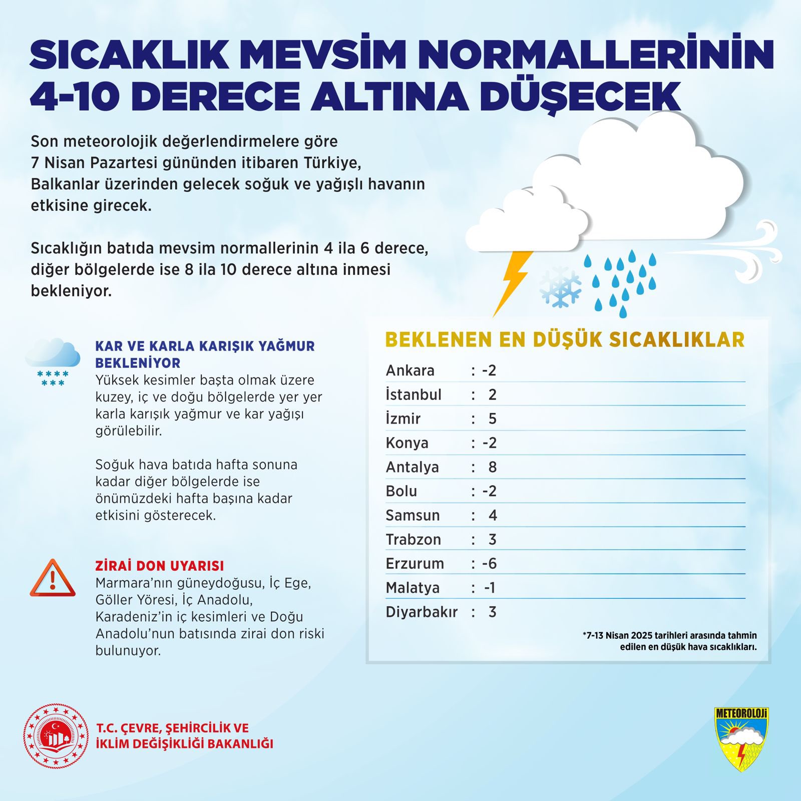 Sıcaklıkların mevsim normallerinin altına düşeceğini bildiren Meteoroloji Genel Müdürlüğü, 10 il için sarı kodlu uyarı yayımladı. Çevre, Şehircilik ve İklim Değişikliği Bakanlığı, bugünden itibaren hafta sonuna kadar ülke genelinde sıcaklıkların mevsim normallerinin 4 ila 10 derece altına düşeceğini bildirdi. Bakanlığın sosyal medya hesabından yapılan açıklamaya göre Balkanlar üzerinden gelecek soğuk ve yağışlı havanın etkisine girecek yurtta, sıcaklıklar batı kesimlerde mevsim normallerinin 4-6 derece, diğer bölgelerde ise 8-10 derece altına inecek. Meteoroloji’den edinilen bilgiye göre soğuk hava batıda hafta sonuna kadar, diğer bölgelerde ise gelecek hafta başına kadar etkisini gösterecek. Ayrıca Marmara’nın güneydoğusu, İç Ege, Göller Yöresi, İç Anadolu, Karadeniz’in iç kesimleri ve Doğu Anadolu’nun batısında zirai don riski bulunuyor. En düşük sıcaklığın Ankara’da sıfırın altında 2, İstanbul’da 2, İzmir’de 5, Konya’da sıfırın altında 2, Antalya’da 8, Bolu’da sıfırın altında 2, Samsun’da 4, Trabzon’da 3, Erzurum’da sıfırın altında 6, Malatya’da sıfırın altında 1 ve Diyarbakır’da 3 derece olması bekleniyor. Kaynak: Çevre, Şehircilik ve İklim Değişikliği Bakanlığı Meteoroloji’nin bugüne ilişkin tahminlerine göre ise yurt genelinin parçalı ve çok bulutlu, aralıklı sağanak ve gök gürültülü sağanak yağışlı geçeceği tahmin edildi. Yağışların, Marmara, Kıyı Ege ile Manisa, Ardahan, Kars, Erzurum, Tunceli, Muş ve Bingöl çevrelerinde yerel kuvvetli olması beklendiğinden yaşanabilecek olumsuzluklara karşı dikkatli ve tedbirli olunması istendi. Rüzgârın ise Marmara’da kuzey ve kuzeydoğu, Orta ve Doğu Karadeniz kıyılarında Batı ve Kuzeybatı, Ege ve Akdeniz’in iç kesimleri, İç Anadolu’nun güney ve doğusu, Karadeniz’in iç kesimleri, Doğu Anadolu ile Güneydoğu Anadolu’nun kuzeyinde güney ve güneybatı yönlerden kuvvetli ve kısa süreli fırtına (40-70 km/sa) şeklinde eseceği beklendiğinden yaşanabilecek olumsuzluklara karşı dikkatli olunması gerektiği aktarıldı. Bu kapsamda Türkiye için Uyarı Durumu haritasında Aydın, Balıkesir, Bursa, Çanakkale, Edirne, İstanbul, İzmir, Kırklareli, Manisa ve Tekirdağ için sarı kodlu uyarıda bulunuldu. Kaynak: Meteoroloji