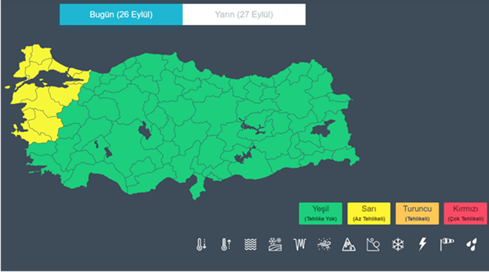 Meteoroloji Genel Müdürlüğü, kuvvetli rüzgar ve fırtına nedeniyle 11 il için sarı kodlu uyarıda bulundu. Meteoroloji Genel Müdürlüğü, bugüne (26 Eylül 2025) ilişkin hava durumu tahmin raporunu yayımladı. Meteoroloji Genel Müdürlüğü tarafından yapılan tahminlere göre, yurdun kuzey kesimlerinin parçalı, yer yer çok bulutlu; Orta ve Doğu Karadeniz kıyıları ile Kırklareli, İstanbul, Kocaeli, Sakarya, Yalova, Kastamonu, Sinop, Tokat ve Artvin çevreleri, Bursa'nın ve Balıkesir’in kuzeyi ile Çanakkale’nin iç kesimlerinin yerel olmak üzere sağanak yağışlı; diğer yerlerin az bulutlu ve açık geçeceği öngörülüyor. Gece saatlerinde Marmara ve Karadeniz'in iç kesimlerinde pus ve yer yer sis bekleniyor. Hava sıcaklığının, güney ve doğu kesimlerde mevsim normallerinin (1-3 derece) altında, diğer yerlerde mevsim normalleri civarında seyredeceği düşünülüyor. Sarı kodlu uyarı verilen iller Rüzgarın ise Marmara ile Kuzey Ege kıyılarında kuzey ve kuzeydoğu yönlerden kuvvetli ve kısa süreli fırtına şeklinde esmesi bekleniyor. İlgili rapora göre İstanbul, Balıkesir, Bursa, Çanakkale, Edirne, İzmir, Kırklareli, Kocaeli, Manisa, Tekirdağ ve Yalova’da yaşayan vatandaşların kuvvetli rüzgara karşı gerekli önlemleri almaları ve yetkililerin uyarılarını takip etmeleri gerekiyor. Kaynak: MeteoUyarı [news_id:786175]