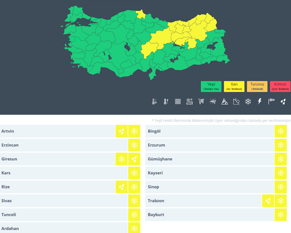 Sıcaklıkların mevsim normallerinin 6 ila 8 derece altına düşeceğini bildiren Meteoroloji Genel Müdürlüğü, 15 il için sarı kodlu uyarı yayımladı. Meteoroloji Genel Müdürlüğü tarafından yapılan tahminlere göre bugün (19 Şubat 2025) Türkiye genelinin parçalı ve çok bulutlu, Marmara (Çanakkale hariç), İç Ege, Orta ve Doğu Akdeniz, İç Anadolu, Karadeniz, Doğu ve Güneydoğu Anadolu ile Isparta çevrelerinin aralıklı yağışlı geçeceği öngörülüyor. Yağışların Orta ve Doğu Akdeniz ile Güneydoğu Anadolu'da yağmur ve sağanak, yağış alan diğer yerlerde karla karışık yağmur ve kar şeklinde olması bekleniyor. Bu kapsamda Artvin, Giresun, Rize, Trabzon, Bingöl, Erzincan, Erzurum, Gümüşhane, Kars, Kayseri, Sinop, Sivas, Tunceli, Bayburt ve Ardahan'da kar yağışının kuvvetli olacağı tahmin ediliyor. Kaynak: Meteoroloji Çığ riski devam ediyor Öte yandan Meteoroloji, soğuk hava ve yağışla birlikte buzlanma ve don olaylarına karşı da uyarıda bulunarak, Doğu Anadolu ve Doğu Karadeniz'in iç kesimlerinde çığ riskinin devam ettiğini bildirdi. 3 büyük ilde hava nasıl olacak? İstanbul ve Ankara'da ise bugünden itibaren kar yağışının etkili olacağı aktarıldı. İzmir'de de sıcaklıkların düşmesi beklenirken yağışların yağmur şeklinde olacağı paylaşıldı. Öte yandan soğuk ve yağışlı havaların şubat ayı sonuna kadar etkisini sürdüreceği bildirildi. Kaynak: Meteoroloji