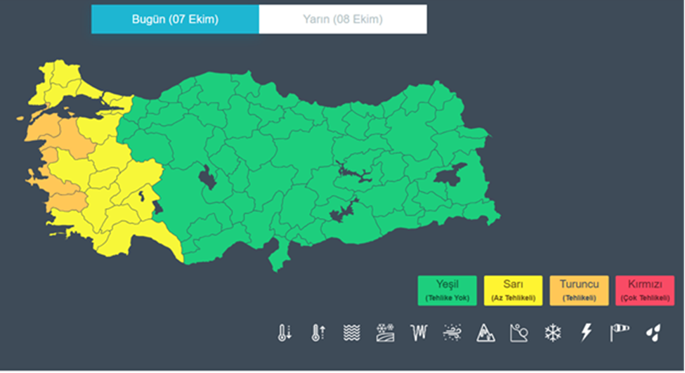 Meteoroloji Genel Müdürlüğü, bugün beklenen gök gürültülü sağanak yağış için 20 ile yönelik sarı ve turuncu kodlu uyarı yayımladı. Meteoroloji Genel Müdürlüğü bugüne (7 Ekim 2025) ilişkin hava durumu tahmin raporunu yayımladı. Meteoroloji Genel Müdürlüğü (MGM) tarafından yapılan son değerlendirmelere göre yurdun kuzey, iç ve batı kesimlerinin parçalı ve çok bulutlu, Marmara, Ege, Batı Akdeniz ile Ankara'nın batısı, Eskişehir. Bolu ve Düzce çevrelerinin sağanak ve gök gürültülü sağanak yağışlı, diğer yerlerin az bulutlu ve açık geçeceği tahmin ediliyor. Yağışların, Marmara, Ege ve Batı Akdeniz ile Ankara’nın batı ilçeleri ve Eskişehir çevrelerinde kuvvetli, Güney ve Kuzey Ege kıyılarında çok kuvvetli ve yerel şiddetli olması bekleniyor. Hava sıcaklığının, batı kesimlerde 3 ila 5 derece azalacağı, diğer yerlerde mevsim normallerinin üzerinde seyredeceği tahmin ediliyor. Rüzgarın ise genellikle güneyli yönlerden hafif, ara sıra orta kuvvette, İç Anadolu’nun güney ve doğusu, Doğu Karadeniz’in iç kesimleri ile Doğu Anadolu’nun kuzeyinde kuvvetli olarak (40-60 km/saat) esmesi bekleniyor. Uyarı verilen iller Yağışların Marmara, Ege ve Batı Akdeniz ile Ankara’nın batı ilçeleri ve Eskişehir çevrelerinde kuvvetli, Güney ve Kuzey Ege kıyılarında çok kuvvetli ve yerel şiddetli olması beklendiğinden, oluşabilecek olumsuzluklara (ulaşımda aksamalar, sel, su baskını, vb) karşı dikkatli ve tedbirli olunması gerekiyor. Sarı ve turuncu kodla uyarı verilen iller ise şöyle sıralanıyor: Afyonkarahisar, Antalya, Aydın, Balıkesir, Burdur, Bursa, Çanakkale, Denizli, Edirne, Isparta, İstanbul, İzmir, Kırklareli, Kocaeli, Kütahya, Manisa, Muğla, Tekirdağ, Uşak, Yalova. Kaynak: MeteoUyarı