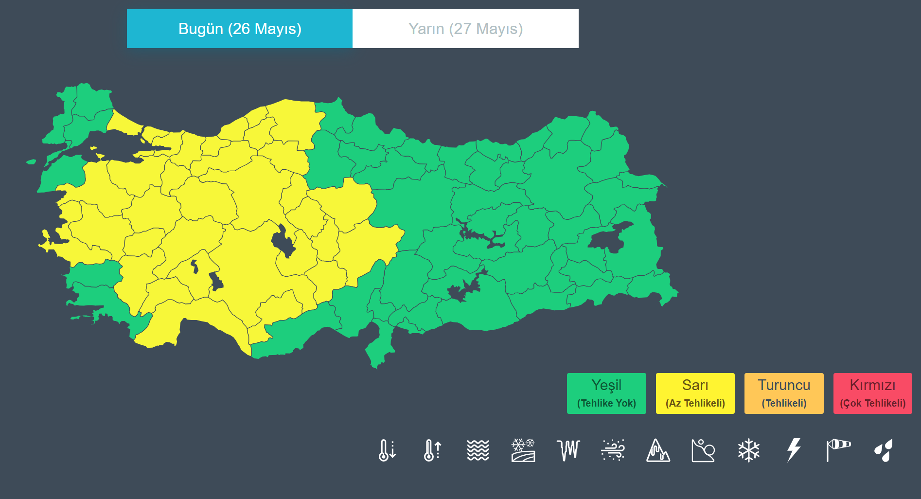 Meteoroloji Genel Müdürlüğü, bugün beklenen gök gürültülü sağanak yağışı ve fırtına nedeniyle 34 il için sarı kodlu uyarı yayımladı. Meteoroloji Genel Müdürlüğü bugüne (26 Mayıs 2025) ilişkin hava durumu tahmin raporunu yayımladı. Meteoroloji’nin tahminlerine göre yurt genelinin parçalı ve çok bulutlu, aralıklı sağanak ve gök gürültülü sağanak yağışlı geçmesi bekleniyor. Uyarılar Yağışların, Marmara'nın doğusu, Batı Karadeniz (Sinop hariç) ile İzmir, Manisa, Kütahya, Eskişehir ve Çankırı çevrelerinde yer yer kuvvetli olması beklendiğinden, Rüzgarın, Ege, Batı Akdeniz'in iç kesimleri, İç Anadolu ve Batı Karadeniz'in iç kesimlerinde yer yer kuvvetli ve kısa süreli fırtına şeklinde (40-70 km/saat) esmesi beklendiğinden, Marmara'nın doğusu, Ege, Akdeniz, İç Anadolu, Batı ve Orta Karadeniz, Doğu Anadolu'nun batısı ile Güneydoğu Anadolu'da toz taşınımı beklendiğinden, yaşanabilecek olumsuzluklara karşı dikkatli ve tedbirli olunması isteniyor. Sarı kodlu uyarı yapılan iller ise şöyle sıralanıyor: Afyonkarahisar, Ankara, Antalya, Balıkesir, Bilecik, Bolu, Burdur, Bursa, Çankırı, Denizli, Eskişehir, Isparta, İstanbul, İzmir, Kastamonu, Kayseri, Kırşehir, Kocaeli, Konya, Kütahya, Manisa, Nevşehir, Niğde, Sakarya, Uşak, Yozgat, Zonguldak, Aksaray, Karaman, Kırıkkale, Bartın, Yalova, Karabük, Düzce. Kaynak: MeteoUyarı