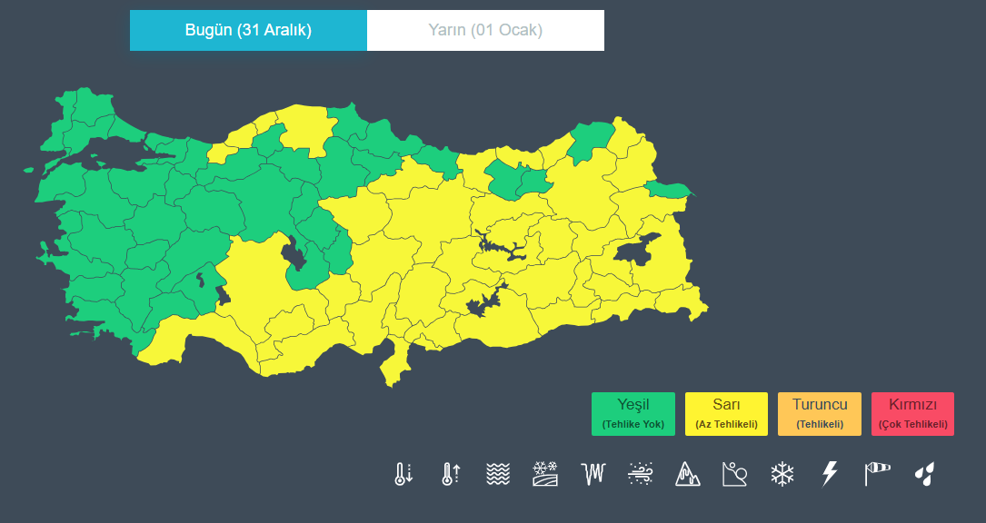 Yurt genelinde kar ve sağanak yağışın hakim olacağını belirten Meteoroloji Genel Müdürlüğü, 42 il için sarı kodlu uyarıda bulundu. Meteoroloji Genel Müdürlüğü, bugüne ilişkin (31 Aralık 2025) hava durumu tahmin raporunu yayımladı. Meteoroloji Genel Müdürlüğü (MGM) tarafından yapılan son değerlendirmelere göre; yurt genelinin parçalı ve çok bulutlu, Marmara'nın doğusu, Güney ve İç Ege, Akdeniz, İç Anadolu ve Karadeniz ile Doğu ve Güneydoğu Anadolu'nun yağışlı geçeceği tahmin ediliyor. Yağışların genellikle karla karışık yağmur ve kar, Güney Ege, Akdeniz’in kıyı kesimleri ile Orta ve Doğu Karadeniz kıyılarında yağmur ve sağanak şeklinde olması bekleniyor. Orta ve Doğu Akdeniz, Batı Karadeniz, Doğu Karadeniz kıyıları, Doğu Anadolu’nun güney ve batısı, Güneydoğu Anadolu, Karaman, Kayseri, Niğde, Sivas, Ordu ve Tokat çevreleri ile Konya'nın güney kesimlerinde kuvvetli olacağı tahmin ediliyor. Yurdun kuzey, iç ve doğu kesimlerinde buzlanma ve don olayı bekleniyor. Doğu Karadeniz’in yüksekleri ile Doğu Anadolu’nun doğusunun yükseklerinin yüksek kar örtüsüne sahip eğimli kesimlerinde çığ tehlikesi bulunuyor. Hava sıcaklığının ise kuzey, iç ve batı kesimlerde hissedilir derecede (4 ila 10) azalacağı tahmin ediliyor. Rüzgarın da batı kesimlerde kuzey yönlerden, doğu kesimlerde güney ve doğu yönlerden hafif, ara sıra orta kuvvette; İç Anadolu'nun kuzeydoğusu, Doğu Karadeniz'in iç kesimleri, Doğu Anadolu ile Güneydoğu Anadolu’nun doğusunda güney ve güneydoğu yönlerden kuvvetli ve kısa süreli fırtına (40-70 km/saat) şeklinde esmesi bekleniyor. Sarı kodla uyarı verilen iller Sarı kodla uyarı verilen iller ise şöyle sıralanıyor: Adana, Adıyaman, Ağrı, Antalya, Bingöl, Bitlis, Diyarbakır, Elazığ, Erzincan, Erzurum, Antep, Giresun, Hakkari, Hatay, Mersin, Kars, Kastamonu, Kayseri, Konya, Malatya, Kahramanmaraş, Mardin, Muş, Niğde, Rize, Siirt, Sivas, Tokat, Trabzon, Tunceli, Urfa, Van, Yozgat, Zonguldak, Karaman, Batman, Şırnak, Bartın, Ardahan, Kilis, Osmaniye ve Düzce. [news_id:797077]