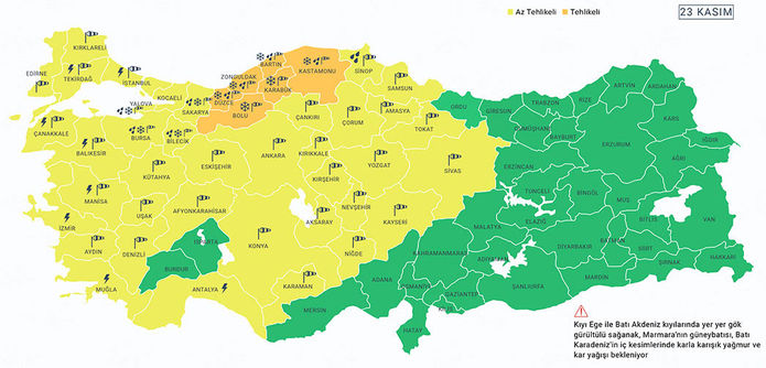Meteoroloji Genel Müdürlüğü, fırtına, sağanak ve kar yağışı nedeniyle 38 ili sarı, 6 ili de turuncu kodla uyardı. Meteoroloji Genel Müdürlüğü tarafından yapılan son tahminlere göre ülkemiz genelinin parçalı ve çok bulutlu, Marmara, Ege, Akdeniz, İç Anadolu, Batı ve Orta Karadeniz ile Doğu Karadeniz kıyılarının yağışlı geçeceği tahmin ediliyor. Yağışların genellikle yağmur ve sağanak, Kıyı Ege ile Batı Akdeniz kıyılarında yer yer gök gürültülü sağanak; Marmara’nın güneydoğusu, Batı Karadeniz’in iç kesimleri ile akşam saatlerinden sonra iç bölgelerde karla karışık yağmur ve kar şeklinde olması bekleniyor. Rüzgarın ise Marmara, Batı Karadeniz, Kuzey Ege, İç Anadolu ve Akdeniz'in iç kesimlerinde kuzeyli yönlerde kuvvetli, yer yer fırtına (50-80km/saat) şeklinde eseceği tahmin ediliyor. Sarı kodlu uyarı verilen iller Afyonkarahisar, Amasya, Ankara, Antalya, Aydın, Balıkesir, Bilecik, Bursa, Çanakkale, Çankırı, Çorum, Denizli, Edirne, Eskişehir, İstanbul, İzmir, Kayseri, Kırklareli, Kırşehir, Kocaeli, Konya, Kütahya, Manisa, Muğla, Nevşehir, Niğde, Sakarya, Samsun, Sinop, Sivas, Tekirdağ, Tokat, Uşak, Yozgat, Aksaray, Karaman, Kırıkkale, Yalova Turuncu kodlu uyarı verilen iller Zonguldak, Bartın, Karabük, Düzce, Bolu, Kastamonu Kaynak: AA THY 38 seferini iptal etti Türk Hava Yolları Basın Müşaviri Yahya Üstün ise sosyal medya hesabından İstanbul Havalimanı’ndan varış ve kalkışlı 38 seferin iptal edildiğini açıkladı. THY Basın Müşaviri Yahya Üstün sosyal medya hesabından paylaşımında şu ifadelere yer verdi: “Değerli yolcularımız, Meteorolojik Acil Durum Komitesi (MADKOM) tarafından, İstanbul’da beklenen şiddetli fırtına nedeniyle alınan %10 kapasite kısıtlama kararı gereği İstanbul Havalimanı kalkış/varışlı 23 Kasım tarihli toplam 38 seferimiz (10’u içhat, 28’i dış hat) iptal edilmiştir.”