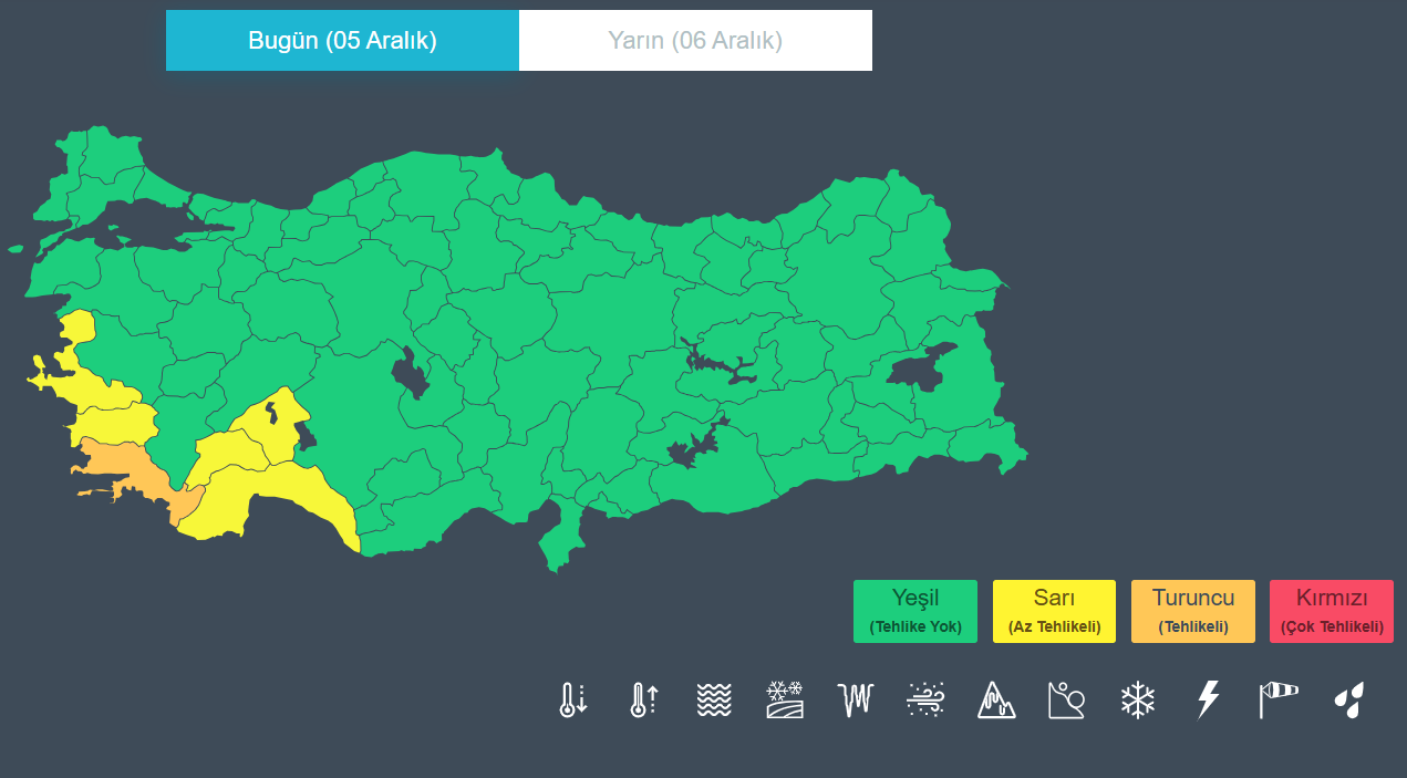 Meteoroloji Genel Müdürlüğü, bugün beklenen kuvvetli yağış ve rüzgar için 6 ile yönelik sarı ve turuncu kodlu uyarı yayımladı. Meteoroloji Genel Müdürlüğü tarafından yapılan tahminlere göre yurt genelinin parçalı, yer yer çok bulutlu; Marmara'nın güneyi, Ege, Akdeniz, İç Anadolu, Batı ve Orta Karadeniz'in iç kesimleri, Doğu ve Güneydoğu Anadolu'nun batı kesimleri ile Edirne, Kırklareli, Diyarbakır ve Mardin çevrelerinin yağışlı geçeceği tahmin ediliyor. Yağışların, Batı Akdeniz, İzmir ve Aydın kıyıları ile Denizli'nin güney ilçelerinde kuvvetli, Antalya ve Muğla çevrelerinde yerel çok kuvvetli ve şiddetli olması beklendiğinden yaşanabilecek olumsuzluklara karşı (ani sel, su baskını, yıldırım, yerel dolu yağışı, kıyı kesimlerde hortum riski, ulaşımda aksamalar vb.) dikkatli ve tedbirli olunması isteniyor. Hava sıcaklığının, mevsim normallerinin üzerinde seyretmeye devam edeceği öngörülürken; rüzgarın genellikle doğu ve güneydoğu yönlerden hafif ara sıra orta kuvvette, Ege ve Akdeniz kıyılarında kuvvetli olarak (40-60 km/saat) esmesi bekleniyor. Sarı ve turuncu kodla uyarı verilen iller ise şöyle sıralanıyor: İzmir, Antalya, Aydın, Burdur, Isparta ve Muğla. Kaynak: MGM