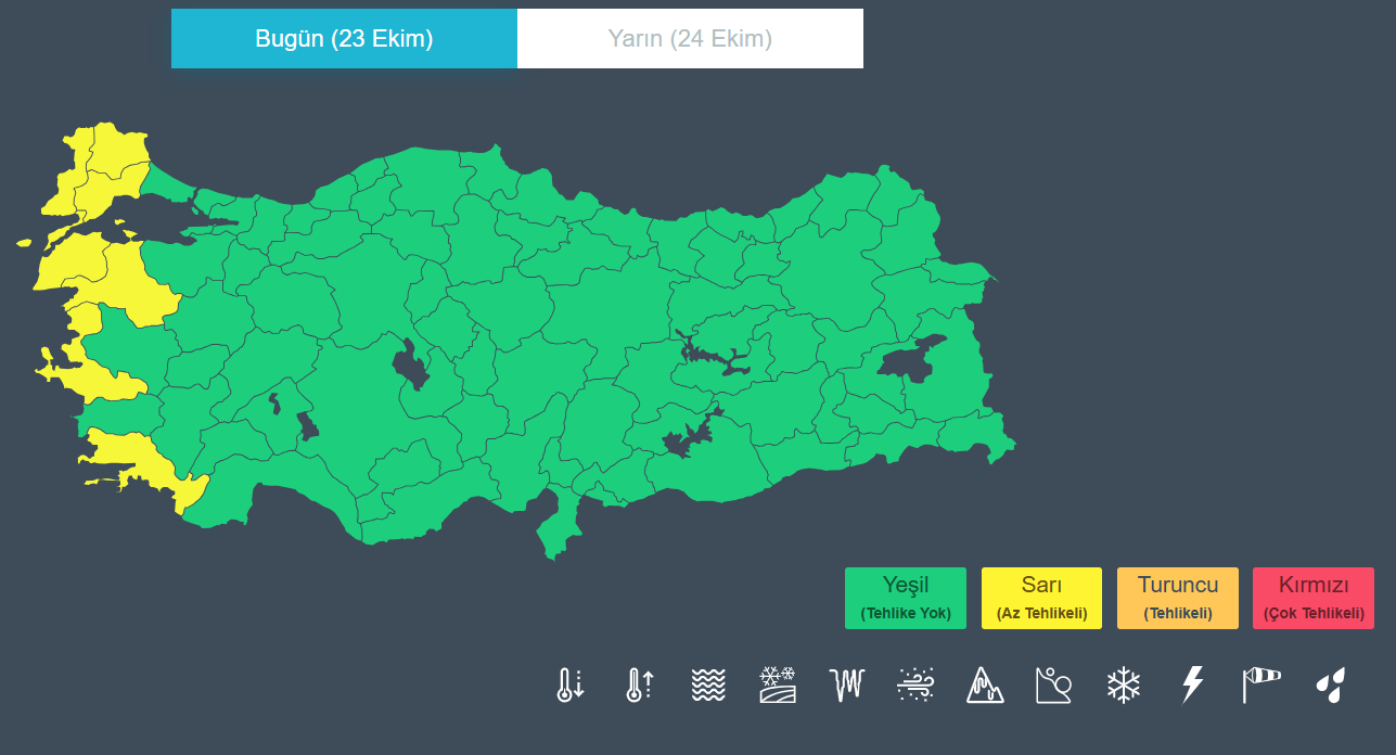 Meteoroloji Genel Müdürlüğü, bugün beklenen gök gürültülü sağanak yağış için 7 ile yönelik sarı kodlu uyarı yayımladı. Meteoroloji Genel Müdürlüğü bugüne (23 Ekim 2025) ilişkin hava durumu tahmin raporunu yayımladı. Meteoroloji Genel Müdürlüğü tarafından yapılan tahminlere göre, yurt genelinin parçalı, yer yer çok bulutlu; Marmara, Ege, Batı Akdeniz, Doğu Akdeniz’in Toroslar mevkii, İç Anadolu'nun kuzeybatısı, Batı Karadeniz (Sinop hariç), Doğu Karadeniz, Doğu Anadolu (Hakkari hariç), Güneydoğu Anadolu'nun doğusu ile Osmaniye, Kahramanmaraş, Aksaray, Yozgat, Sivas, Ordu ve Tokat çevrelerinin yağmur ve sağanak; batı kesimlerin yer yer gök gürültülü sağanak; Doğu Karadeniz’in iç kesimlerinin yüksekleri ile Doğu Anadolu’nun kuzeydoğusunun yükseklerinin karla karışık yağmur ve yer yer kar yağışlı geçeceği tahmin ediliyor. Hava sıcaklığının, kuzey, iç ve doğu kesimlerde 2 ila 4 derece artacağı, diğer yerlerde önemli bir değişiklik olmayacağı tahmin ediliyor. Kuvvetli yağış uyarısı Yağışların ise Kuzey Ege kıyıları ile Edirne'nin ve Kırklareli’nin güneyi, Tekirdağ’ın batısı ve Çanakkale çevrelerinde yer yer kuvvetli olması bekleniyor. Sarı kodla uyarı verilen iller şöyle sıralanıyor: Balıkesir, Çanakkale, Edirne, İzmir, Kırklareli, Muğla ve Tekirdağ. Kaynak: MeteoUyarı
