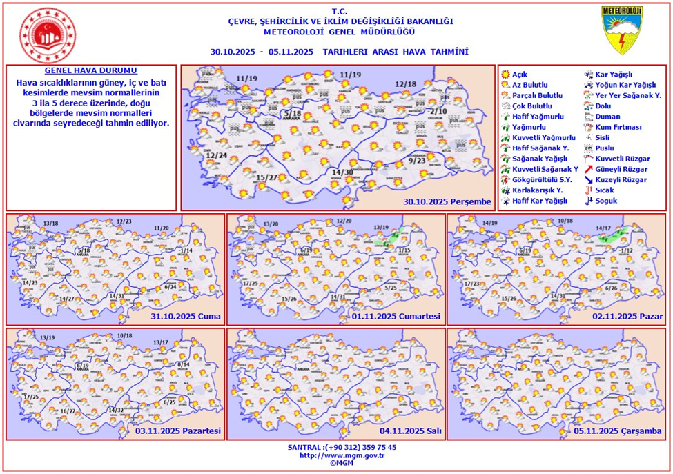 Meteoroloji Genel Müdürlüğü’nün yayımladığı son rapora göre ülke genelinde kasımın ilk haftasında sıcak hava dalgası etkili olacak. Güneydoğu’da sıcaklıklar 6 dereceye kadar yükselirken Marmara ve Karadeniz’de yer yer sağanak geçişleri yaşanacak. Meteoroloji Genel Müdürlüğü’nün (MGM) son tahminlerine göre, 31 Ekim-6 Kasım tarihleri arasında hava sıcaklıkları yurt genelinde mevsim normallerinin üzerinde seyredecek. İlgili rapora göre Marmara Bölgesi’nde cuma günü kısa süreli yağış geçişleri beklenirken hafta sonu itibarıyla güneş yeniden yüzünü gösterecek. İstanbul’da sıcaklık 23–24 derece civarında seyredecek. Ege kıyılarında da yazı aratmayan günler yaşanacak. İzmir’de 26–28 dereceye kadar çıkan hava sıcaklığı, kasım ayı ortalamasının 4 derece üzerinde yer alacak. Akdeniz’de yağış öngörülmezken Antalya, Adana ve Mersin’de sıcaklıklar 30 dereceye yaklaşacak. İç Anadolu’da gündüzler ılık, geceler serin geçecek. Ankara’da gündüz 21, gece 9 derece civarında seyredecek. Karadeniz kıyılarında ise parçalı bulutlu bir gökyüzüyle birlikte Zonguldak, Kastamonu ve Sinop çevrelerinde hafif yağışlar yaşanacak. Doğu ve Güneydoğu Anadolu’da ise hava açık ve sıcak olacak. Sıcaklıklar Diyarbakır’da 28, Şanlıurfa’da 31–32 dereceye kadar çıkacak. “Pastırma sıcakları başlıyor” Meteoroloji Uzmanı Orhan Şen de Türkiye genelinde önümüzdeki günlerde yağışsız bir döneme girileceğini duyurdu. Şen, hava durumuna ilişkin paylaşımında, “Tüm ülkede yağışsız günler bir süre daha devam edecek. Kasım ayının 9'una kadar yağış yok görünüyor. Sıcaklıklar ortalamanın 4-5 derece üzerinde. Öğlen güneşlenme ile dahada ısınıyoruz. Kış mevsimine gireceğiz D vitamine ihtiyacımız olacak. Güneşlenmeyi kaçırmayın. Halk arasında “Pastırma Sıcakları” denilen haftaya giriyoruz" dedi. Kaynak: Meteoroloji