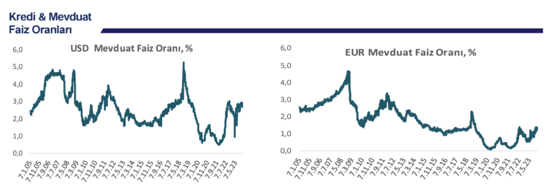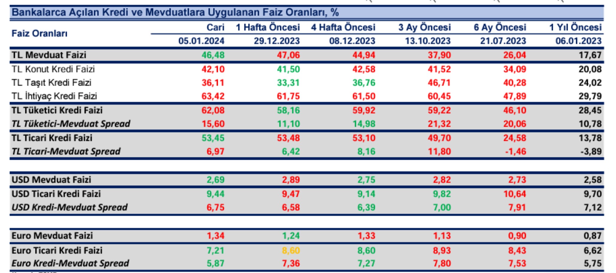 Merkez Bankası'nın 2023 yılında uyguladığı şahin politikanın ardından yükselişe geçen faizlerde yeni yıla girilmesiyle birlikte hareketlilik hız kazandı. İşte mevduat ve kredi faizlerinde güncel tablo.. Bizim Menkul tarafından bugün paylaşılan araştırma notuna göre bankaların TL mevduat için uyguladıkları faiz oranı 05 Ocak haftasında bir önceki haftaya göre 58 baz puan azalışla %46,48 olurken, dolar mevduat faizi 20 baz puan azalışla %2,69 ve Euro mevduat faizi 10 baz puan artışla %1,34 oldu. TL bazlı ticari kredilerin faiz oranı aynı haftada bir önceki haftaya göre 3 baz puan azalışla %53,45 olurken, TL bazlı konut kredisi faizleri 60 baz puan artışla %42,10, taşıt kredisi faizleri 280 baz puan artışla %36,11 ve ihtiyaç kredisi faizleri 167 baz puan artışla %63,42 olarak gerçekleşti. Dolar bazlı ticari kredilerin faiz oranı aynı haftada 3 baz puan azalışla %9,44 olurken, Euro bazlı ticari kredilerin faiz oranı 139 baz puan azalışla %7,21 oldu. Kaynak: Bizim Menkul Öte yandan mevduat bankalarındaki tüketici kredilerinin 395 milyar 694 milyon 332 bin lirası konut, 73 milyar 53 milyon 76 bin lirası taşıt ve 961 milyar 806 milyon 934 bin lirası diğer kredilerden oluştu. Bankacılık sektörünün TCMB dahil toplam kredi hacmi de 5 Ocak ile biten haftada 31 milyar 623 milyon 351 bin lira artarak 11 trilyon 221 milyar 98 milyon 928 bin liraya yükseldi. Toplam kredi hacmi geçen yılın aynı dönemine kıyasla ise yüzde 54,03 artış kaydetti. Kaynak: Bizim Menkul [news_id:720374]