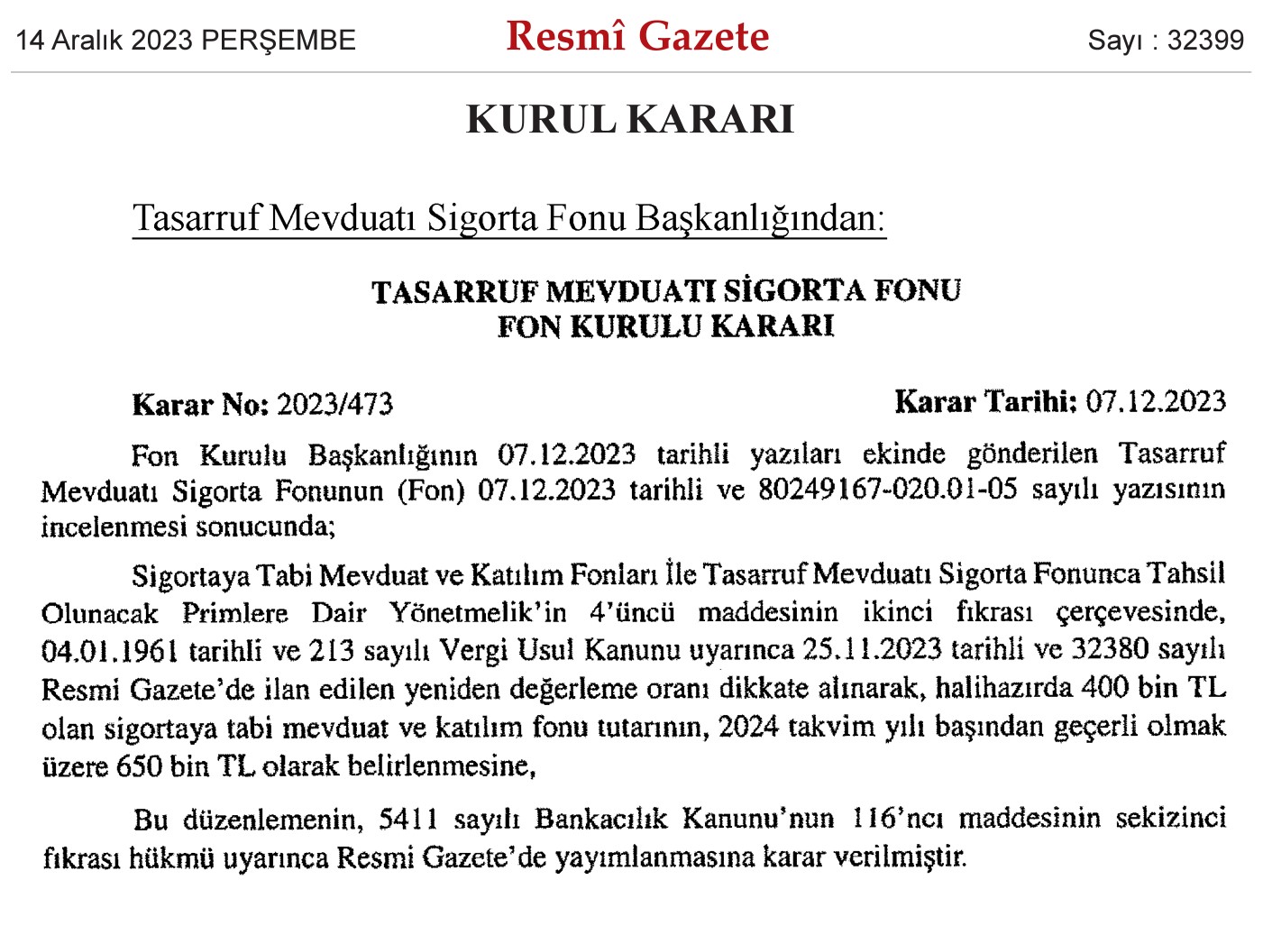 Bankalardaki mevduatın 400 bin lira olan devlet güvencesine tabi tutarı, 1 Ocak 2024'ten itibaren 650 bin lira olarak belirlendi. Peki, hangi varlıklar güvence altında? İşte detaylar.. Tasarruf Mevduatı Sigorta Fonu'nun sigortaya tabi mevduat ve katılım fonları ile TMSF tarafından tahsil olunacak primlere dair yönetmelikte değişiklik yapıldı. Resmi Gazete'de yayımlanan TMSF Fon Kurulu'nun kararı ile, sigortaya tabi mevduat ve katılım fon tutarları artırıldı. Buna göre, bankalardaki mevduatın 400 bin lira olan devlet güvencesine tabi tutarı, 1 Ocak 2024'ten itibaren 650 bin lira olarak güncellendi. Kaynak: Resmi Gazete Sosyal medyada ekonomi paylaşımlarıyla bilinen beşyüzyedi ise güvencenin kapsamını şöyle aktardı: Klasik notlar: 1. Her tür döviz & altın mevduatı sigortaya tâbi. 2. Ticari mevduat da dâhil. 3. Mevduat veya katılım fonu kapsamında olmayan hiçbir şey dâhil değil. 4. 650 bin TL tutarı, bir bankadaki tüm varlığınız için geçerli bir şemsiye. (***Ayrı bankadaki tutara ayrı sigorta...) 5. Bankaların yönetim kurulu & ailelerinin mevduatı sigortaya tâbi değil. 6. Offshore hesaplar korumasız. 7. Menkul kıymetler ≠ mevduat 8. Ortak hesaplarda her kişi ayrı ayrı korumalı. 9. Hem şahıs hem ticari hesabı olanlar ayrı ayrı korumalı. 10. İşlemiş faizler de korumalı. *** Bir A kişisinin X Bankasında 300.000 TL, Y Bankasında ise 750.000 TL tasarruf mevduatı varsa; X Bankasındaki mevduatının tamamı ve Y Bankasındaki mevduatının da 650.000 TL'lik kısmı güvence kapsamında olacak. [news_id:718031]
