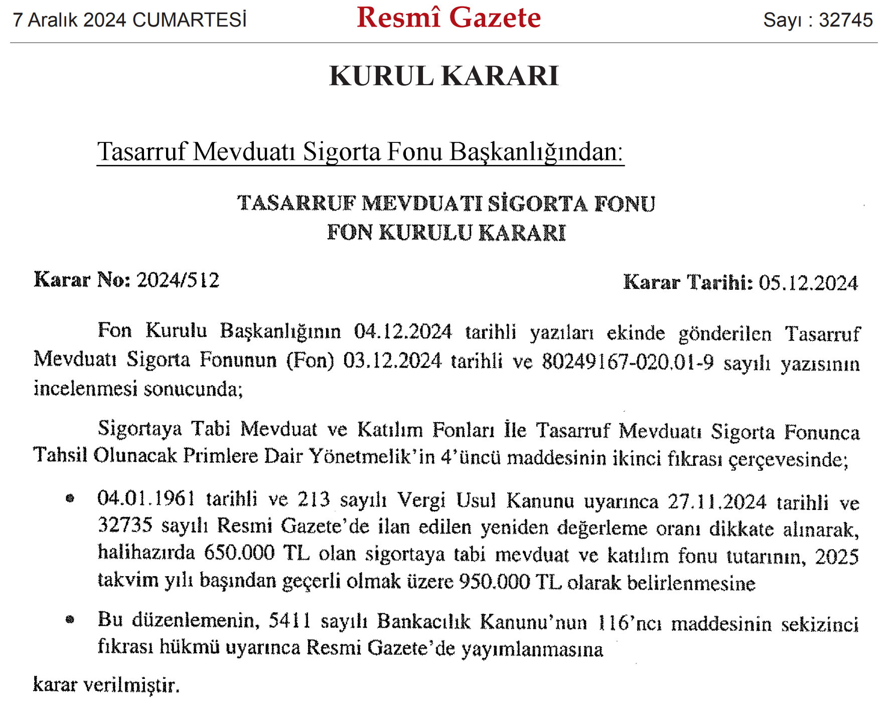 Bankalardaki mevduatın devlet güvencesine tabi tutarı, 1 Ocak 2025'ten itibaren geçerli olacak şekilde artırıldı. Tasarruf Mevduatı Sigorta Fonu'nun sigortaya tabi mevduat ve katılım fonları ile TMSF tarafından tahsil olunacak primlere dair yönetmelikte değişiklik yapıldı. Resmi Gazete'de yayımlanan TMSF Fon Kurulu'nun kararı ile sigortaya tabi mevduat ve katılım fon tutarları artırıldı. Buna göre, bankalardaki mevduatın 650 bin lira olan devlet güvencesine tabi tutarı, 1 Ocak 2025'ten itibaren 950 bin lira olarak güncellendi. Kaynak: Resmi Gazete Böylelikle yeni yıldan itibaren bankadaki 950 bin TL tutara kadar mevduat, devlet güvencesi altına alınacak. Ayrı bankada tutulan tutar ise yine 950 bin TL'ye kadar koruma altında olacak. Buna göre bir A kişisinin X Bankasında 800.000 TL, Y Bankasında ise 1.250.000 TL tasarruf mevduatı varsa; X Bankasındaki mevduatının tamamı ve Y Bankasındaki mevduatının da 950.000 TL'lik kısmı güvence kapsamında olacak.