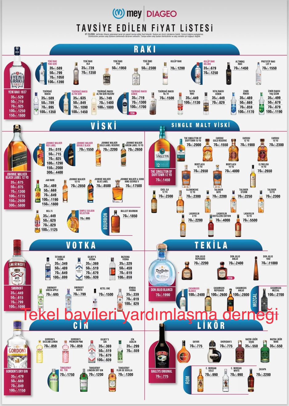Tekel Bayileri Yardımlaşma Derneği Başkanı Erol Dündar, sosyal medya hesabından yaptığı duyuruda, Mey grubundaki alkollü içkilere zam yapıldığını açıkladı. Tekel Bayileri Yardımlaşma Derneği Başkanı Erol Dündar, alkollü içkilere yapılan zammı sosyal medya hesabından duyurdu. Dündar, zamlı fiyat listesini, “Mey gurubu premium ürün ve şarap gurubuna zam geldi” notuyla paylaştı. Dündar, daha önce yaptığı açıklamalarda, ekim ayının ilk haftasında yeni zamların gelebileceğini aktarmış, maliyet artışları nedeniyle yüzde 5 ile yüzde 15 arasında bir zam beklendiğini dile getirmişti. Gruba ait alkollü içkilere son olarak ise temmuz ayının başında yüzde 20 ila 25 oranında zam yapılmıştı. Dündar'ın paylaştığı listeye göre bugünden itibaren geçerli olan zamla 35'lik Yeni rakı ve Tekirdağ rakının fiyatı 589 lira; 50'lik Yeni rakının fiyatı 799, Tekirdağ rakının fiyatı 789 lira; 70'lik Yeni rakının fiyatı 1.050 lira, Tekirdağ rakının fiyatı ise 995 lira oldu.