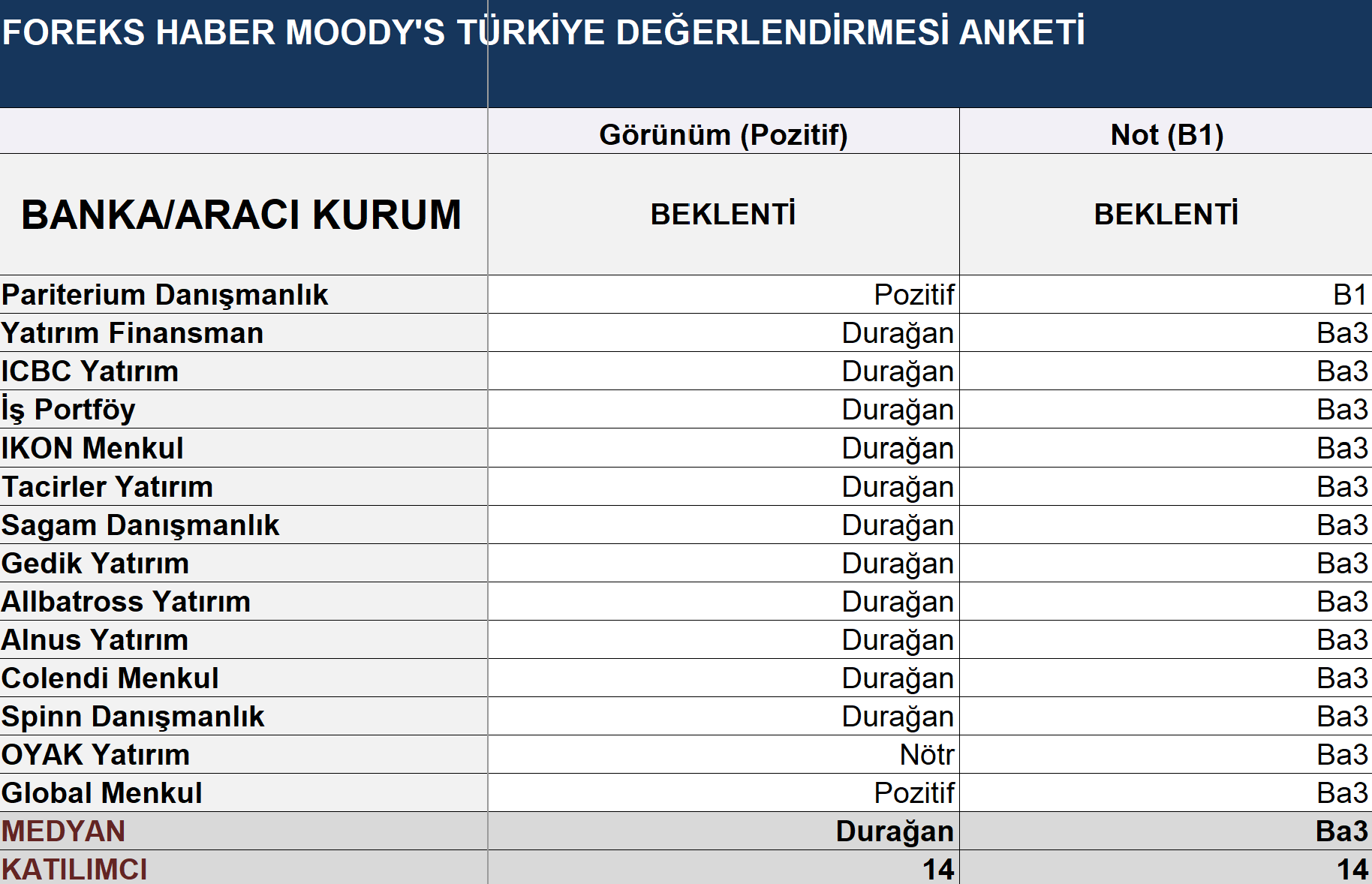 Moody’s gelecek hafta Türkiye’ye ilişkin not kararını açıklayacak. Peki, karara ilişkin ekonomistlerin beklentisi ne yönde? İşte detaylar.. Uluslararası kredi derecelendirme kuruluşu Moody’s, Türkiye’ye ilişkin not kararını 24 Ocak Cuma gecesi açıklayacak. Foreks Haber tarafından hazırlanan ankete katılan ekonomistler ise kredi notunun “B1”den “Ba3”e yükseltileceğini, görünümün ise “durağan” olarak korunacağını tahmin etti. Buna göre 14 ekonomistin 13’ü kredi notunun “B1”den “Ba3”e bir kademe yükseltileceğini, 1’i ise notun “B1” olarak sabit bırakılacağını öngördü. 11 ekonomist görünümün “durağan” olarak korunacağını aktarırken, 2 ekonomist “pozitif”, 1 ekonomist ise “nötr” beklentisini paylaştı. Moody’s, Türkiye’nin kredi notunu en son 19 Temmuz 2024’te kredi notunu “B3”ten “B1”e yükseltmiş ve görünümünü “pozitif” olarak korumuştu. Kaynak: Foreks Haber