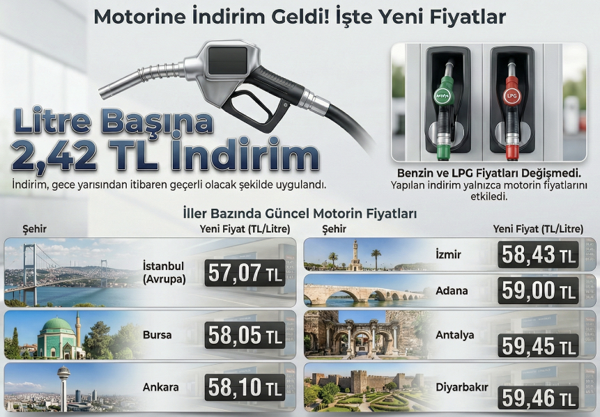 Motorinin litresine gece saatlerinden itibaren geçerli olacak şekilde indirime gidildi. İşte indirim sonrası 7 ilde güncel akaryakıt fiyatları.. Kasım ayında 4 TL'nin üzerinde fiyat artışı gerçekleşen motorin fiyatlarına gece saatleri itibarıyla indirim geldi. Motorinin litresine gece saatlerinden itibaren geçerli olacak şekilde ortalama 2,42 TL indirim yapıldı. İndirimin ardından İstanbul Avrupa yakasında motorinin litresi 57,07 lira, Bursa'da 58,05 lira, Ankara'da 58,10 lira, İzmir'de 58,43 lira, Adana'da 59 lira, Antalya'da 59,45 lira, Diyarbakır'da ise 59,46 lira oldu. Benzin ve LPG fiyatlarında ise herhangi bir değişiklik gerçekleşmedi. Akaryakıt fiyatları nasıl hesaplanıyor? Türkiye'de benzin ve motorin fiyatları hesaplanırken; Gümrüksüz rafineri fiyatına ÖTV ve EPDK payının eklenmesiyle KDV hariç Rafineri satış fiyatı bulunuyor. Gümrüksüz Rafineri Fiyatı hesaplanırken ise Akdeniz-İtalyan piyasasında yayınlanan günlük CIF Akdeniz ürün fiyatları ve günlük dolar kuru takip edilerek, belli bir fiyat değişim farkında gümrüksüz rafineri tavan satış fiyatı elde ediliyor. [news_id:792910]