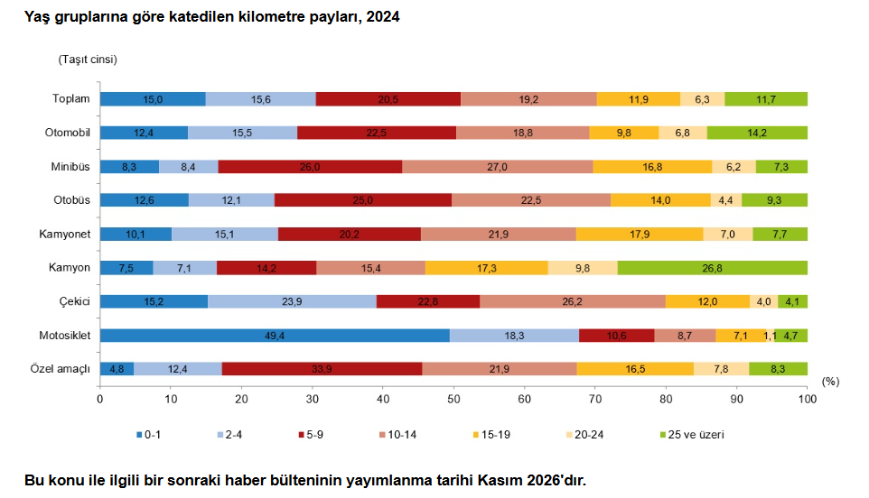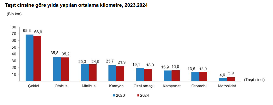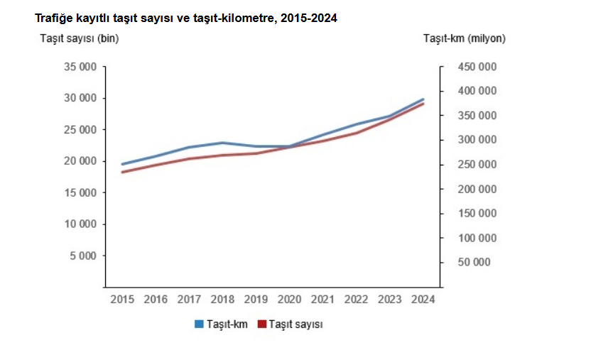 Türkiye'de trafiğe kayıtlı motorlu kara taşıtlarınca 2024'te katedilen yol, 382 milyar 870 milyon kilometre oldu. Türkiye İstatistik Kurumu, 2024 yılına ilişkin taşıt-kilometre istatistiklerini açıkladı. Türkiye'de 2024 yılında trafiğe kayıtlı motorlu kara taşıtları tarafından 382 milyar 870 milyon kilometre yol katedildi. Toplam taşıt-km'nin %57,0'ı otomobiller, %19,2'si kamyonetler, %8,7'si motosikletler, %5,7'si çekiciler, %3,8'i kamyonlar, %3,3'ü minibüsler, %1,9'u otobüsler ve %0,5'i özel amaçlı taşıtlar tarafından yapıldı. Taşıt sayısı %9,3, toplam taşıt-km miktarı %10,0 arttı Türkiye'de 2024 yılında trafiğe kayıtlı toplam motorlu kara taşıtları sayısı bir önceki yıla göre %9,3 artarken toplam taşıt-km %10,0 artış gösterdi. Taşıt sayısı; motosikletlerde %23,3, özel amaçlı taşıtlarda %9,3, otomobillerde %6,6, çekicilerde %6,3, kamyonetlerde %4,8, minibüslerde %4,0, kamyonlarda %3,2, otobüslerde %1,3 artış gösterirken, taşıt-km motosikletlerde %59,9, otomobillerde %9,1, kamyonetlerde %5,2, çekicilerde %4,4, özel amaçlı taşıtlarda %2,7, minibüslerde %1,8 artıp kamyonlarda %5,1, otobüslerde ise %0,6 azaldı. Otomobiller yılda ortalama 13 bin 859 kilometre yaptı Taşıtların bir yılda yaptıkları ortalama kilometreler incelendiğinde; 2024 yılında sırasıyla çekicilerin 66 bin 893, otobüslerin 35 bin 150, minibüslerin 24 bin 917, kamyonların 21 bin 887, özel amaçlı taşıtların 18 bin, kamyonetlerin 15 bin 965, otomobillerin 13 bin 859 ve motosikletlerin 5 bin 896 kilometre yaptığı hesaplandı. Otomobiller tarafından katedilen mesafenin %39,4'ünü dizel yakıtlılar yaptı Otomobiller tarafından 2024 yılında katedilen mesafe taşıtların yakıt türlerine göre incelendiğinde; toplam taşıt-km'nin %39,4'ü dizel, %28,5'i LPG'li, %27,9'u benzinli, %3,1'i hibrit ve %1,0'ı elektrikli otomobiller tarafından yapıldı. En fazla mesafe 5-9 yaş grubu taşıtlar tarafından katedildi Türkiye'de 2024 yılında katedilen toplam mesafe taşıtların yaş gruplarına göre incelendiğinde; en fazla yol %20,5'lik oranla taşıt filosunun %16,8'ini oluşturan 5-9 yaş grubu taşıtlar tarafından yapılırken, bunu sırasıyla %19,2 ile 10-14 yaş, %15,6 ile 2-4 yaş, %15,0 ile 0-1 yaş, %11,9 ile 15-19 yaş, %11,7 ile 25 yaş ve üzeri ve %6,3 ile 20-24 yaş grubu taşıtlar takip etti. Bu oran otomobillerde 5-9 yaş otomobiller için %22,5, 10-14 yaş için %18,8, 2-4 yaş için %15,5, 25 yaş ve üzeri için %14,2, 0-1 yaş için %12,4, 15-19 yaş için %9,8 ve 20-24 yaş için ise %6,8 oldu.