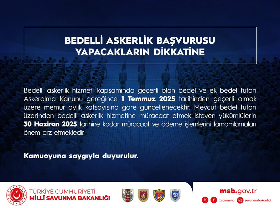 Milli Savunma Bakanlığı (MSB), bedelli askerlik yapmak isteyenlere yönelik uyarıda bulundu. MSB, sosyal medya hesabından yaptığı açıklamada, bedelli askerlik hizmeti kapsamında geçerli olan bedel ve ek bedel tutarının, 1 Temmuz 2025’ten itibaren memur aylık katsayısına göre güncelleneceğini hatırlattı. Mevcut tutar üzerinden bedelli askerlik yapmak isteyenler için son tarihin 30 Haziran olduğunu aktaran MSB, ödeme işlemlerinin bu tarihe kadar tamamlanması gerektiğini bildirdi. MSB’nin konuya ilişkin sosyal medya paylaşımı şöyle oldu: “Bedelli askerlik hizmeti kapsamında geçerli olan bedel ve ek bedel tutarı Askeralma Kanunu gereğince 1 Temmuz 2025 tarihinden geçerli olmak üzere memur aylık katsayısına göre güncellenecektir. Mevcut bedel tutarı üzerinden bedelli askerlik hizmetine müracaat etmek isteyen yükümlülerin 30 Haziran 2025 tarihine kadar müracaat ve ödeme işlemlerini tamamlamaları önem arz etmektedir.” Kaynak: MSB [news_id:775440]