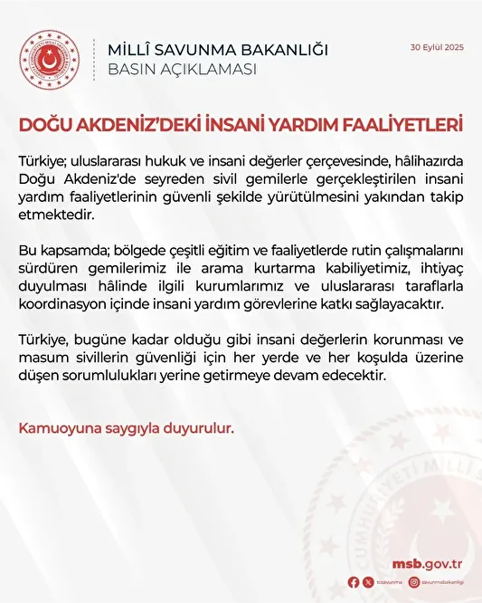 Doğu Akdeniz’de seyreden sivil gemilerin insani yardım faaliyetlerini yakından takip ettiklerini vurgulayan Milli Savunma Bakanlığı, ihtiyaç duyulması halinde Türk gemilerinin arama-kurtarma kabiliyeti ve mevcut imkânlarıyla uluslararası taraflarla koordineli şekilde sürece katkı sağlayacağını açıkladı. Gazze’ye insani yardım ulaştırmak ve İsrail’in ablukasını kırmak amacıyla yola çıkan Küresel Sumud Filosu, Akdeniz’de seyrine devam ediyor. 31 Ağustos’ta İspanya’dan hareket eden 22 tekneden oluşan filo, yaklaşık 50 ülkenin desteğini alarak Gazze’ye her geçen gün biraz daha yaklaşıyor. Son olarak Küresel Sumud Filosu'nun tehlikeli yolculuğu sürerken Türk Deniz Kuvvetleri'nin filoya havadan ve denizden insanî amaçlı destek vermeye başladığı bildirilmişti. MSB'den konuya ilişkin yeni bir açıklama daha geldi. MSB’den yapılan açıklamada şunlar aktarıldı: "Türkiye; uluslararası hukuk ve insani değerler çerçevesinde, halihazırda Doğu Akdeniz'de seyreden sivil gemilerle gerçekleştirilen insani yardım faaliyetlerinin güvenli şekilde yürütülmesini yakından takip etmektedir. Bu kapsamda; bölgede çeşitli eğitim ve faaliyetlerde rutin çalışmalarını sürdüren gemilerimiz ile arama kurtarma kabiliyetimiz, ihtiyaç duyulması halinde ilgili kurumlarımız ve uluslararası taraflarla koordinasyon içinde insani yardım görevlerine katkı sağlayacaktır." Kaynak: MSB
