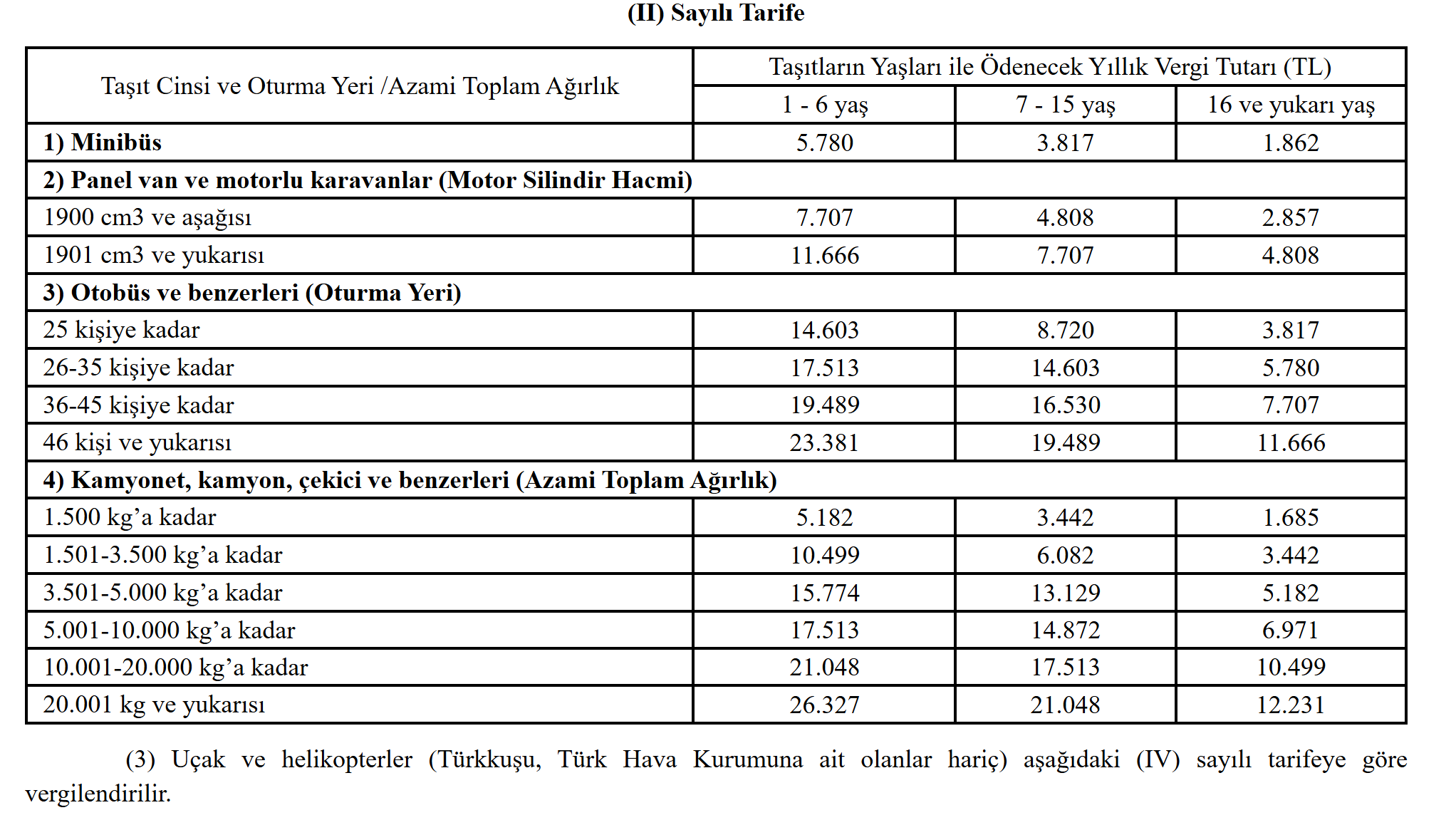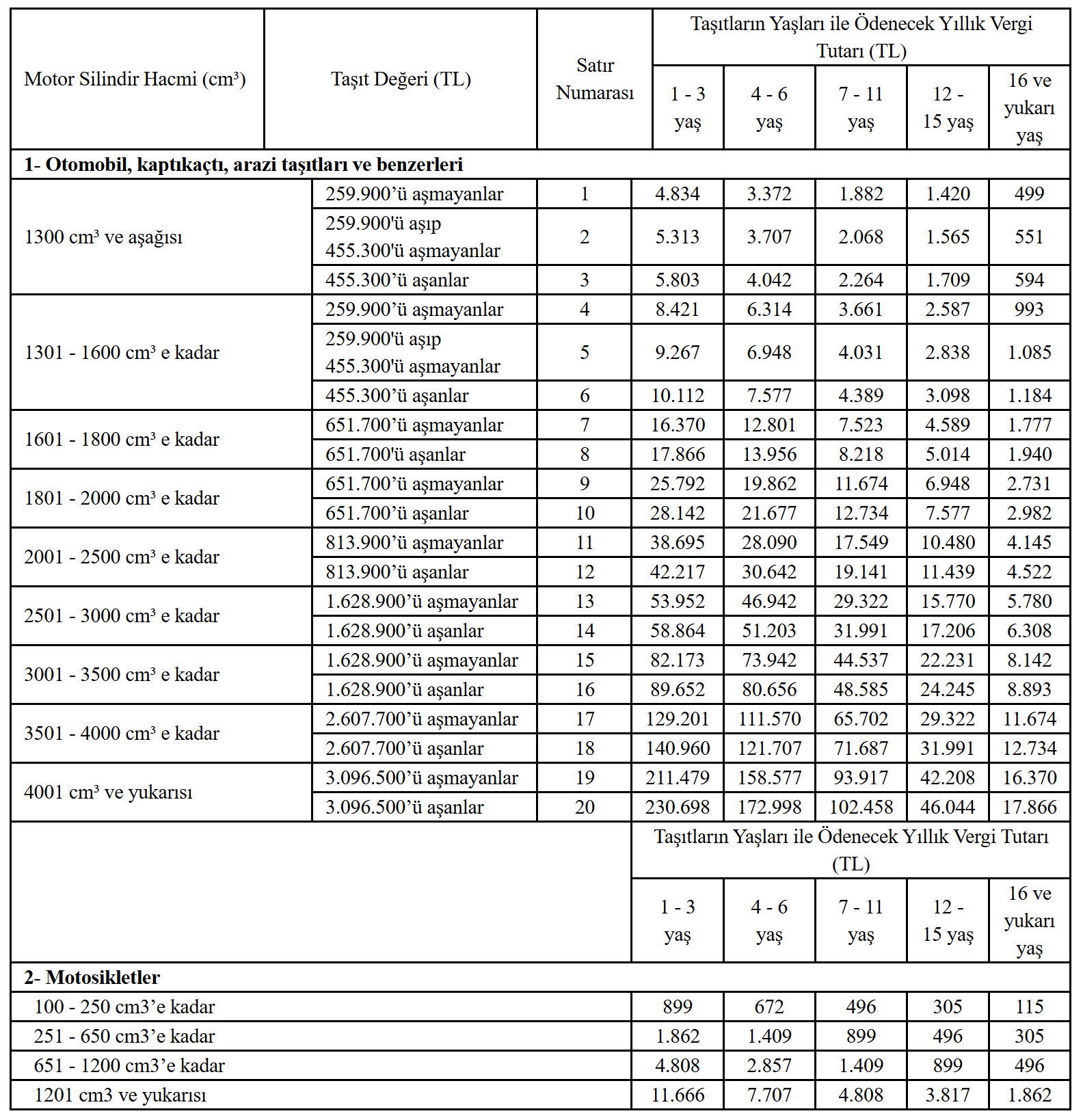 Resmi Gazete’de yayımlanan tebliğ ile 2025’te geçerli olacak MTV artışı belli oldu. 1 Ocak tarihinden itibaren geçerli olacak Motorlu Taşıtlar Vergisi tutarları (MTV) Resmi Gazete'de ilan edildi. Önceki yıllarda olduğu gibi yeniden değerleme oranında değişiklik yetkisi kullanılmayınca MTV'de YDO kadar (yüzde 43,93) artış yapıldı. Böylelikle sıfır araçta en düşük MTV 4 bin 834 liraya çıktı. Yaş ve motor hacmine göre MTV tutarları da şöyle listelendi: Kaynak: Resmi Gazete Kaynak: Resmi Gazete Kaynak: Resmi Gazete
