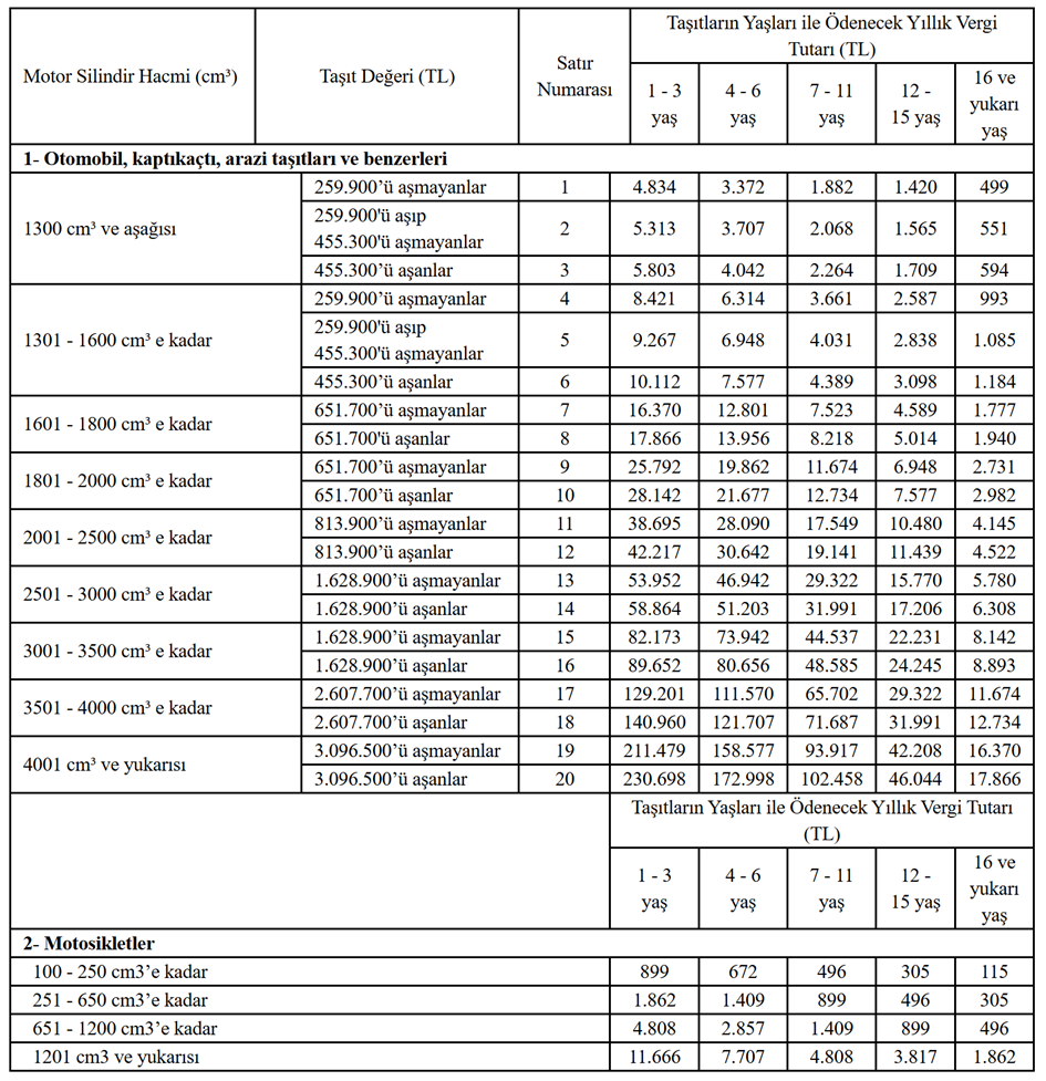 2025 yılına ilişkin motorlu taşıtlar vergisi (MTV) ve 2024'te elde edilen kazançlara ilişkin gelir vergisinin ikinci taksitinin ödeme süresi perşembe günü sona erecek. Ödeme yapmayan vatandaşlar ise aylık yüzde 4,5 gecikme faizini ödemek zorunda kalacak. Gelir İdaresi Başkanlığının (GİB) internet sitesinde yer alan duyuruda Motorlu Taşıtlar Vergisi'nin (MTV) ödeme detaylarına ilişkin bilgi verildi. İlgili duyuruda milyonlarca araç sahibini ilgilendiren MTV ödemelerinin birçok kanaldan yapılabileceği aktarıldı. Duyuruya göre ödemeler, vergi daireleri, PTT ve banka şubeleri aracılığıyla gerçekleştirilebilecek. Taksit ödemeleri, GİB Mobil Uygulaması, anlaşmalı bankaların kredi ve banka kartları veya banka hesabı, yabancı ülkede faaliyet gösteren bankalara ait kartlar, anlaşmalı bankaların şubeleri, internet ve telefon bankacılığı ile mobil bankacılık gibi alternatif ödeme kanallarından da yapılabilecek. Ödemeyenlere gecikme faizi uygulanacak Ödemesini 31 Temmuz'a kadar yapmayanlar için aylık yüzde 4,5 gecikme faizi uygulanacak. Borç zamanında ödenmezse vergi dairesi tarafından e-haciz işlemi de başlatılabilecek. Öte yandan araçların muayenesinin yaptırılabilmesi için MTV'nin ödenmiş olması gerekliliği bulunuyor. 2025 MTV tutarları Bu yıla ilişkin MTV tutarları Cumhurbaşkanı Kararı gereği yeniden değerleme oranında (yüzde 43,93) artırılmıştı. Böylelikle sıfır araçta en düşük MTV 4 bin 834 liraya çıkmıştı. Yaş ve motor hacmine göre MTV tutarları ise şöyle sıralanmıştı: Kaynak: Resmi Gazete