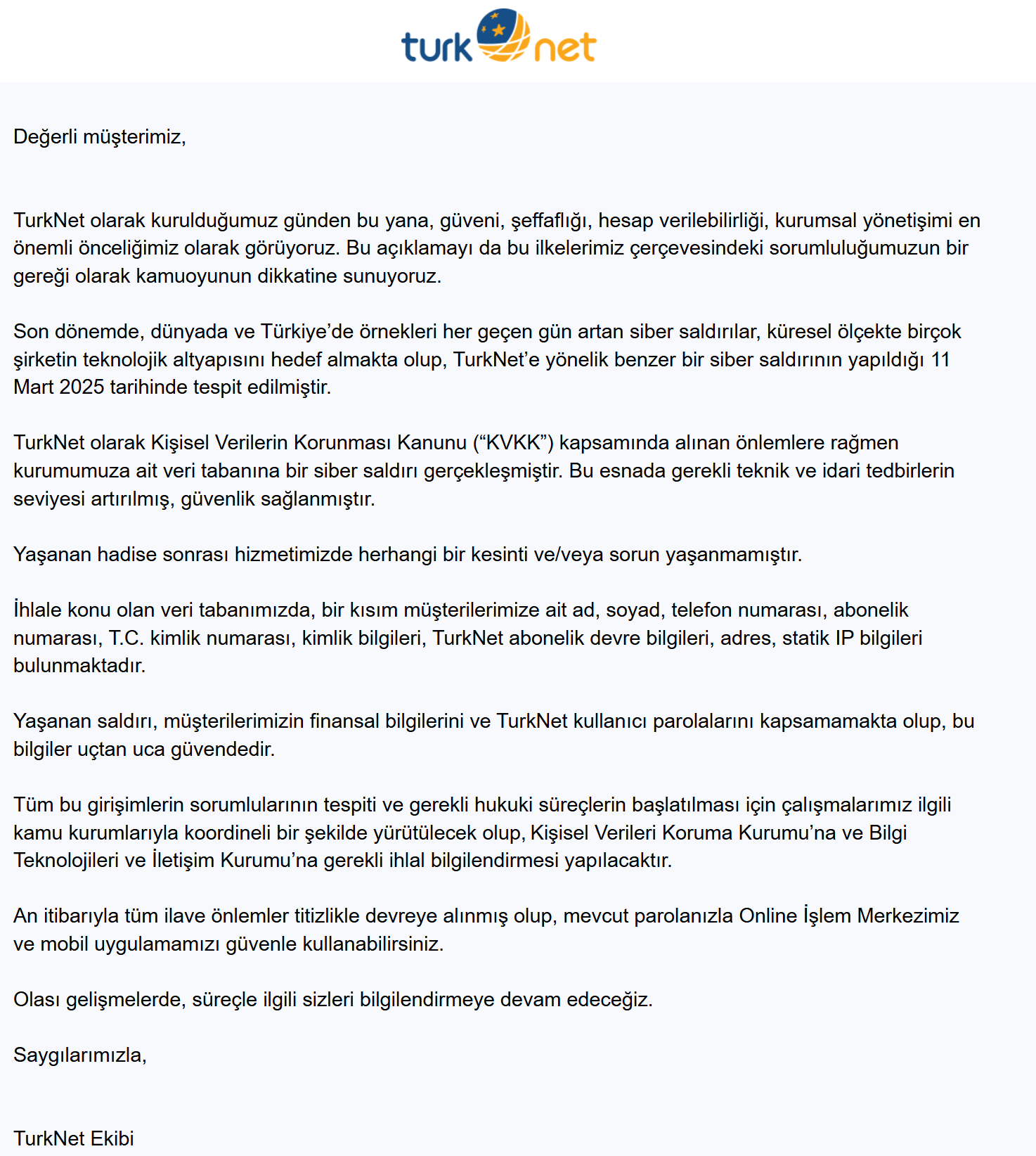11 Mart'ta siber saldırıya uğrayan TurkNet, müşterilerin finansal bilgilerinin ve kullanıcı parolalarının güvende olduğunu açıkladı. İnternet sağlayıcısı TurkNet, 11 Mart'ta siber saldırıya uğramıştı. Siber saldırı sonrasında ise müşterilerin kimlik bilgilerinin çalındığı iddia edilmişti. Şirketten yapılan açıklamada ise yaşanan saldırının müşterilerin finansal bilgilerini ve TurkNet kullanıcı parolalarını kapsamadığı ve bilgilerin güvende olduğu bildirildi. TürkNet’in açıklamasına göre, siber saldırıda ele geçirilen veri tabanında müşterilerin ad, soyad, telefon numarası, T.C. kimlik numarası, abonelik numarası, kimlik bilgileri, adres, statik IP ve abonelik devre detayları bulunuyor. Şirket, ihlalin tam kapsamını belirlemek için çalışmalarını sürdürüyor. Şirketin konuya ilişkin açıklaması ise şöyle: "TurkNet olarak kurulduğumuz günden bu yana, güveni, şeffaflığı, hesap verilebilirliği, kurumsal yönetimi en önemli önceliğimiz olarak görüyoruz. Bu açıklamayı da bu ilkelerimiz çerçevesindeki sorumluluğumuzun bir gereği olarak kamuoyunun dikkatine sunuyoruz. Dünyada ve Türkiye’de giderek artan siber saldırılar kapsamında, TurkNet’e yönelik benzer bir siber saldırının yapıldığı 11 Mart 2025 tarihinde tespit edilmiştir. Uzaktan çalışmaya en uygun ülkeler: Türkiye, internet ve sağlık hizmetlerinde sınıfta kaldıHaberler Öncelikle, hizmetlerimizde herhangi bir kesinti veya sorun yaşanmadığını belirtmek isteriz. Yaşanan saldırı, müşterilerimizin finansal bilgilerini ve TurkNet kullanıcı parolalarını kapsamamakta olup, bu bilgiler uçtan uca güvendedir. Tüm bu girişimlerin sorumlularının tespiti ve gerekli hukuki süreçlerin başlatılması için çalışmalarımız ilgili kamu kurumlarıyla koordineli bir şekilde yürütülecek olup, Kişisel Verileri Koruma Kurumu’na ve Bilgi Teknolojileri ve İletişim Kurumu’na gerekli ihlal bilgilendirmesi yapılmıştır. An itibarıyla tüm ilave önlemler titizlikle devreye alınmış olup, mevcut parolanızla Online İşlem Merkezimiz ve mobil uygulamamızı güvenle kullanabilirsiniz. Bu olaydan etkilenen müşterilerimizle doğrudan iletişime geçerek tüm süreci şeffaf bir şekilde yönetmeyi sürdürüyoruz. Siber güvenliği en üst seviyede tutmaya ve müşterilerimize kesintisiz, güvenilir hizmet sunmaya devam edeceğiz." Kaynak: TurkNet