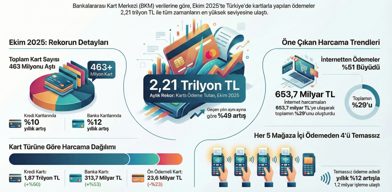 BKM verilerine göre kartlı harcama tutarı ekim ayında yıllık bazda yüzde 49 artarak 2,21 trilyon TL ile tüm zamanların en yüksek seviyesine ulaştı. Ekonomistler ise rekor artışın tüketici alışkanlıklarının değişmesinden kaynaklandığını aktardı. Bankalararası Kart Merkezi (BKM), 2025 yılı ekim ayındaki kartlı ödeme verilerini yayımladı. BKM verilerine göre Türkiye’de toplam kart sayısı ekim itibarıyla 463,2 milyon adede ulaşırken kredi kartı sayısı 140,4 milyon, banka kartı sayısı 215,6 milyon, ön ödemeli kart sayısı ise 107,2 milyon olarak belirlendi. Kredi kartlarında yıllık yüzde 10, banka kartlarında yüzde 12 artış yaşanırken, ön ödemeli kartlarda yüzde 2’lik düşüş yaşandı. Ödeme tutarı 2,21 trilyon TL ile rekor kırdı Ekim ayında kartlarla yapılan toplam ödeme tutarı ise geçen yılın aynı ayına göre yüzde 49 artarak 2,21 trilyon TL’ye çıktı. Böylece aylık bazda tüm zamanların rekoru kırıldı. Bunun 1,87 trilyon TL’si kredi kartlarıyla, 313,7 milyar TL’si banka kartlarıyla, 23,6 milyar TL’si ise ön ödemeli kartlarla gerçekleştirildi. Bu dönemde kredi kartı ödemeleri yüzde 50, banka kartı ödemeleri yüzde 53 artarken ön ödemeli kart ödemeleri yüzde 23 geriledi. Her 5 ödemeden 4’ü temassız Kartlı ödeme işlem adedi ekimde yüzde 11 artış göstererek 1,8 milyar adede yükseldi. İşlemlerin 1,03 milyar adedi kredi kartlarıyla, 714,1 milyon adedi banka kartlarıyla, 58,8 milyon adedi de ön ödemeli kartlarla yapıldı. Banka kartı işlem adetlerinde yüzde 24’lük güçlü artış dikkat çekerken ön ödemeli kartlarla yapılan işlem adedi yüzde 54 oranında geriledi. Kartlarla yapılan temassız ödeme adedi de geçen yılın aynı dönemine göre yüzde 12 artarak 1,2 milyar adede ulaştı. Bu dönemde temassız ödeme tutarı, yüzde 54 artışla 728,1 milyar TL’ye çıktı. Böylece ekim ayında mağaza içi yapılan her 5 kartlı ödemenin 4’ü temassız gerçekleştirilmiş oldu. Karahan: Kayıt dışılığın azalmasından memnuniyet duyuyoruz TCMB Başkanı Fatih Karahan, yılın son enflasyon raporunun sunumu sırasında, nakit kullanımının azalmasından memnuniyet duyduklarını söylemişti. Karahan, konuya ilişkin paylaşımında, “Nakit kullanımıyla ilgili daha önce de açıklamalarımız oldu. Bu kararları verirken teknik ihtiyaca bakıyoruz. Ama mevcut durumun sebep olduğu kayıt dışılığın azalmasından da memnun oluyoruz. Kredi büyümesinin önemli bir kısmı kredi kartları kaynaklı. Bu verileri daha iyi takip etmemizi sağlıyor. Buradaki kullanımın hepsini bireysel kredi olarak değerlendirmek mantıklı değil. Sadece ödeme alışkanlığındaki değişime işaret ediyor. Ancak, bu durum, kayıt dışılığın azalmasını sağladığı için memnuniyet duyuyoruz” ifadeleri kullanmıştı. [news_id:791099] TCMB ekonomistleri: Rekor artış talepten değil alışkanlıkların değişmesinden kaynaklanıyor Türkiye Cumhuriyet Merkez Bankası (TCMB) tarafından yayımlanan son blog yazısında ise kartlı harcamalarda yaşanan artışın talepten değil tüketicilerin nakit alışkanlığını bırakmasından kaynaklandığı belirtilmişti. Kartlı harcamalardaki artışın gerçek talebi yansıtmadığı aktarılan blog yazısında, “Kartla yapılan harcamalar talep dinamiklerini izlemek için değerli bir öncü gösterge niteliği taşıyor. Ancak son yıllarda bu harcamalar ivmelenerek özel tüketim harcamalarından ayrışıyor. Bu ayrışmada, tüketicilerin nakitle ödeme yönteminden kartla ödemeye geçmesi etkili. Bu nedenle, kartla harcama verileri üzerinden talep koşullarını değerlendirirken kart kullanım oranındaki artışın etkisinin arındırılması önem taşıyor” ifadeleri kullanılmıştı. Kaynak: TCMB