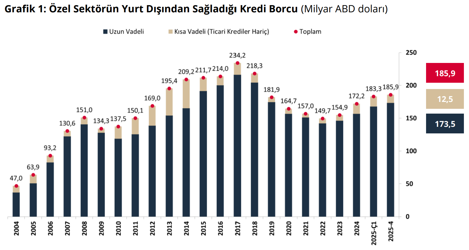 Özel sektörün yurt dışından sağladığı toplam kredi borcu, nisan ayında 2024 yıl sonuna göre 13,8 milyar dolar artarak 185,9 milyar dolar oldu. Türkiye Cumhuriyet Merkez Bankası (TCMB), Nisan 2025 dönemine ilişkin özel sektörün yurt dışı kredi borcu gelişmelerini yayımladı. Buna göre, nisan sonu itibarıyla özel sektörün yurt dışından sağladığı toplam kredi borcu, 2024 yıl sonuna göre 13,8 milyar dolar artarak 185,9 milyar dolar oldu. Vadeye göre incelendiğinde, 2024 yıl sonuna göre uzun vadeli kredi borcu 16,7 milyar dolar artarak 173,5 milyar dolar, kısa vadeli kredi borcu (ticari krediler hariç) ise 2,9 milyar dolar azalarak 12,5 milyar dolar düzeyinde gerçekleşti. 2024 yıl sonuna göre finansal kuruluşların toplam borcu 3,3 milyar dolar, finansal olmayan kuruluşların toplam borcu ise 10,4 milyar dolar arttı. Aynı dönemde finansal kuruluşların uzun vadeli borçları 6,3 milyar dolar, finansal olmayan kuruluşların uzun vadeli borçları 10,4 milyar dolar artış gösterdi. Kısa vadede ise finansal kuruluşların borçları 2,9 milyar dolar azalırken finansal olmayan kuruluşların borçları 0,3 milyar dolar yükseldi. Döviz kompozisyonuna bakıldığında, dolar cinsinden borçlanmanın en yüksek paya sahip olduğu görülürken 173,5 milyar dolar tutarındaki uzun vadeli kredi borcunun yüzde 57,9’unun dolar, yüzde 33'ünün euro, yüzde 2,1’inin Türk lirası ve yüzde 7'sinin ise diğer döviz cinslerinden oluştuğu gözlendi. 12,5 milyar dolar tutarındaki kısa vadeli kredi borcunun ise yüzde 46'sı dolar, yüzde 19,5’i euro, yüzde 31,1’i Türk lirası ve yüzde 3,3’ü ise diğer döviz cinslerinden oluştu. Nisan sonuna göre özel sektörün yurt dışından sağladığı toplam kredi borcunun 1 yıla kadar olan vade dağılımı incelendiğinde, toplam borç tutarı 56,6 milyar dolar oldu. Bu tutarın 37,9 milyar dolarının bankalara, 14,5 milyar dolarının finansal olmayan kuruluşlara, 4,2 milyar dolarının ise bankacılık dışı finansal kuruluşlara ait borçlardan oluştuğu görüldü. Kaynak: TCMB