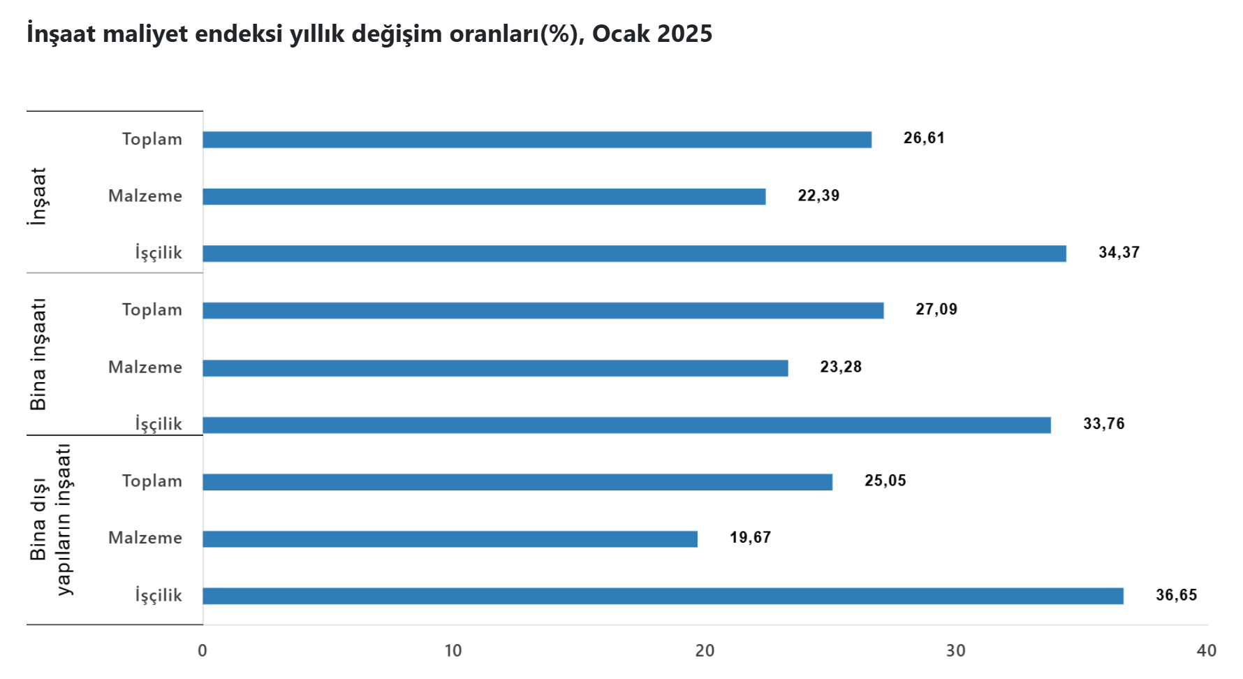 TÜİK verilerine göre inşaat maliyetleri yılın ilk ayında yüzde 26,61 artış kaydetti. Türkiye İstatistik Kurumu (TÜİK) ocak ayına ilişkin inşaat maliyet endeksi verilerini açıkladı. Buna göre inşaat maliyet endeksi, ocak ayında bir önceki aya göre %9,10, bir önceki yılın aynı ayına göre %26,61 arttı. Bir önceki aya göre malzeme endeksi %1,96 arttı, işçilik endeksi %23,58 arttı. Ayrıca bir önceki yılın aynı ayına göre malzeme endeksi %22,39 arttı, işçilik endeksi %34,37 arttı. Bina inşaatı maliyet endeksi, bir önceki aya göre %9,39 arttı, bir önceki yılın aynı ayına göre %27,09 arttı. Bir önceki aya göre malzeme endeksi %1,91 arttı, işçilik endeksi %24,14 arttı. Ayrıca bir önceki yılın aynı ayına göre malzeme endeksi %23,28 arttı, işçilik endeksi %33,76 arttı. Bina dışı yapılar için inşaat maliyet endeksi, bir önceki aya göre %8,13 arttı, bir önceki yılın aynı ayına göre %25,05 arttı. Bir önceki aya göre malzeme endeksi %2,14 arttı, işçilik endeksi %21,58 arttı. Ayrıca bir önceki yılın aynı ayına göre malzeme endeksi %19,67 arttı, işçilik endeksi %36,65 arttı. Kaynak: TÜİK [news_id:756459]