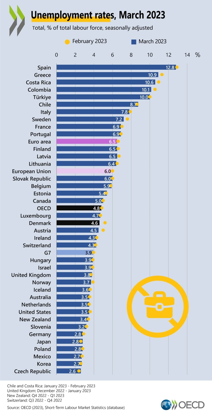 OECD ülkelerinde işsizlik oranı rekor düşük seviyelere gerilerken, Türkiye'nin ilk beş içerisinde yer aldığı görüldü. OECD ülkeleri arasında işsizlik oranı mart ayında değişmeyerek yüzde 4,8'de sabit kaldı. Böylece, işsizlik oranı rekor düşük seviyede kalmayı sürdürdü. Verilere göre 14 OECD ülkesinde işsizlik oranı gerilerken 5 ülkede işsizlik, martta yükseldi. 15 ülkede ise işsizlik oranında bir değişim yaşanmadı. 15-24 yaş grubunu kapsayan genç işsizlik oranı ise yüzde 10,5 ile 2005 sonrası en düşük seviyeye geriledi. En yüksek işsizlik İspanya'da, en düşük oran ise Çekya'da Euro Bölgesinde de işsizlik oranı yüzde 6,5'e gerileyerek rekor düşük seviyeyi gördü. OECD ülkeleri arasında mart ayında en yüksek işsizlik oranı İspanya'da görüldü. İspanya'nın ardından Yunanistan, Kosta Rika ve Kolombiya sıralanırken, Türkiye yüzde 10 işsizlik oranıyla beşinci sırada yer aldı. OECD ülkeleri arasında en düşük işsizlik oranı ise yüzde 2,6 ile Çekya'da gerçekleşti. Kaynak: OECD Türkiye verileri TÜİK verilerine göre Türkiye'de mart ayında dar tanımlı işsizlik oranı yüzde 10, geniş tanımlı işsizlik oranı ise yüzde 21,8 olmuştu. Gençlerde işsizlik oranı ise martta yüzde 20,1'e yükselmişti. İşsizlik oranı erkeklerde yüzde 8,1 iken kadınlarda yüzde 13,8 olarak tahmin edilmişti. Martta işsiz sayısı TÜİK'e göre 4 bin kişi artarak 3 milyon 508 bin kişi oldu.