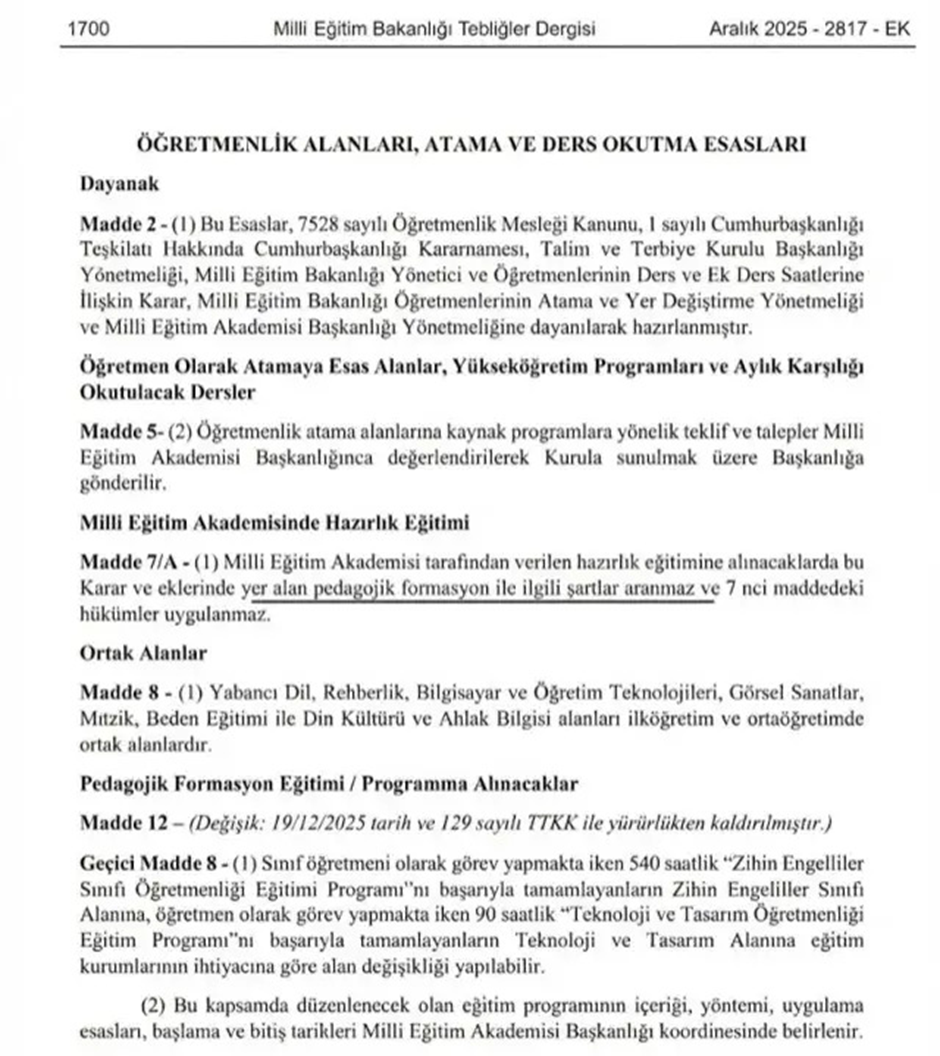 Milli Eğitim Bakanlığı, öğretmenlik mesleğine geçiş sürecinde önemli bir düzenlemeye giderek Milli Eğitim Akademisi'nde verilecek hazırlık eğitimini esas aldı. Yeni kararla birlikte, bu eğitimi tamamlayan adaylardan pedagojik formasyon belgesi istenmeyecek. Milli Eğitim Bakanlığı, Aralık 2025 tarihli ve 2817 sayılı Tebliğler Dergisi'nde yayımlanan düzenleme ile öğretmenlik mesleğine girişte pedagojik formasyon zorunluluğunu kaldırdı. İlgili düzenlemeye göre Milli Eğitim Akademisi'nde verilecek hazırlık eğitimi, pedagojik formasyonun yerine geçecek. 2817 sayılı Tebliğler Dergisi'nde yayımlanan düzenleme ile öğretmenlik mesleğine kaynak teşkil eden fakültelerden mezun olan ve Akademi'deki eğitimi başarıyla tamamlayan adaylar, ayrıca üniversitelerden formasyon sertifikası almak zorunda kalmayacak. Sınıf öğretmenleri için alan değişikliği imkânı Öte yandan tebliğde, "Geçici Madde 8" ile görevde bulunan sınıf öğretmenlerine yönelik düzenlemelere de yer verildi. Düzenlemeye göre, gerekli eğitimleri tamamlayan sınıf öğretmenleri, Zihin Engelliler Sınıf Öğretmenliği ile Teknoloji ve Tasarım alanlarına geçiş yapabilecek. Bu geçişler, eğitim sürelerinin tamamlanması ve kurumların ihtiyaçları doğrultusunda gerçekleştirilecek. Kaynak: MEB tebliği