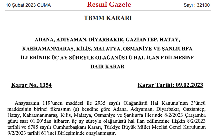 Kahramanmaraş merkezli olarak gerçekleşen ve 10 ili etkileyen depremlerin ardından alınan 3 aylık OHAL kararı Resmi Gazete'de yayımlandı. 6 Şubat günü saat 04:17’de Kahramanmaraş’ın Pazarcık ilçesinde meydana gelen 7,7 büyüklüğündeki depremin yarattığı yıkım, saat 13:24’te Elbistan ilçesinde yaşanan 7,6 büyüklüğündeki ikinci depremle artış gösterdi. Kahramanmaraş’ın yanı sıra Adana, Adıyaman, Diyarbakır, Gaziantep, Hatay, Kahramanmaraş, Kilis, Malatya, Osmaniye ve Şanlıurfa’yı yerle bir eden deprem sonrası ülke genelinde yedi günlük milli yas ilan edildi, üç ay süreyle OHAL ilan edildi. Karar ise Resmi Gazete’de de yayımlandı. Resmi Gazete'de yayımlanan kararda şu ifadelere yer verildi; "Anayasanın 119’uncu maddesi ile 2935 sayılı Olağanüstü Hal Kanunu’nun 3’üncü maddesinin birinci fıkrasının (a) bendine göre Adana, Adıyaman, Diyarbakır, Gaziantep, Hatay, Kahramanmaraş, Kilis, Malatya, Osmaniye ve Şanlıurfa illerinde 8/2/2023 Çarşamba günü saat 01.00’dan itibaren üç ay süreyle olağanüstü hal ilan edilmesine ilişkin 8/2/2023 tarihli ve 6785 sayılı Cumhurbaşkanı Karar Türkiye Büyük Millet Meclisi Genel Kurulunun 9/2/2023 tarihli 61’inci Birleşiminde onaylanmıştır." Kaynak: Resmi Gazete Tıklayın: Erdoğan: Deprem bölgesinde 3 ay süreyle OHAL ilan ediyoruz