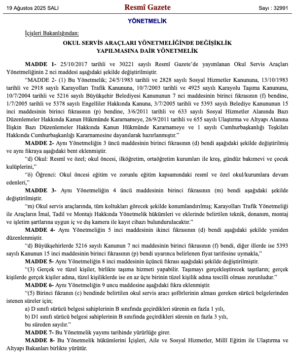Okul servisleriyle ilgili yönetmelikte değişiklik yapıldı. Yeni kararlarla hem öğrenci güvenliği hem de taşımada düzen sağlanması hedefleniyor. 2017 yılında yayımlanan yönetmeliğin ikinci maddesi değiştirildi. Yönetmeliğin artık Sosyal Hizmetler Kanunu’ndan Karayolu Taşıma Kanunu’na, Belediye Kanunu’ndan Cumhurbaşkanlığı Kararnamesine kadar birçok farklı yasal düzenlemeye dayandığı açıkça yazıldı. Yapılan değişiklikle “okul” ifadesi yalnızca resmi ve özel ilköğretim ya da ortaöğretim kurumlarıyla sınırlı kalmadı. Tanıma artık kreşler, gündüz bakımevleri ve çocuk kulüpleri de dahil edildi. Ayrıca “öğrenci” tanımı da okul öncesi eğitim alan ve zorunlu eğitim kapsamındaki tüm kurumlara devam edenleri kapsayacak şekilde yazıldı. Servislerde kamera zorunluluğu Servis araçlarında güvenlik için yeni bir şart getirildi. Araçların tüm koltuklarını görecek şekilde yerleştirilmiş iç ve dış kameraların ve bunlarla bağlantılı kayıt cihazlarının bulunması artık zorunlu oldu. Bu sistemlerin Karayolları Trafik Yönetmeliği ve teknik şartnamelere uygun şekilde kurulması gerektiği de vurgulandı. Yeni kurallara göre büyükşehirlerde fiyatlar Büyükşehir Belediyesi Kanunu’na, diğer illerde ise Belediye Kanunu’na dayanılarak belirlenecek tarifeye göre uygulanacak ve gerçek kişiler ve şirketler birlikte taşıma hizmeti yapabilecek. Şirketlerin en az üçte bir oranında kendi adlarına tescilli araç bulundurması şart koşuldu. Şoför belgeleri için yeni süreler Servis şoförlerinin ehliyet koşullarına da düzenleme geldi. D sınıfı ehliyet sahiplerinin B sınıfında geçirdiği sürenin yalnızca bir yılı, D1 sınıfı ehliyet sahiplerinin ise üç yılı sayılacak. Böylece sürücü belgeleri için bekleme süreleri daha net hale getirildi. Yönetmelik yayımlandığı gün yürürlüğe girdi. İçişleri, Aile ve Sosyal Hizmetler, Milli Eğitim ile Ulaştırma ve Altyapı Bakanlıkları düzenlemelerin uygulanmasından sorumlu olacak.